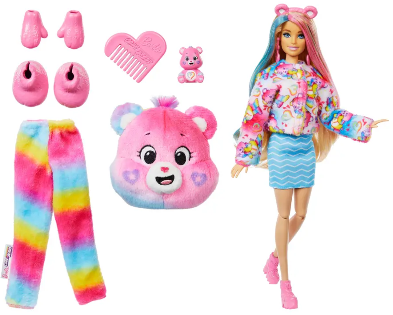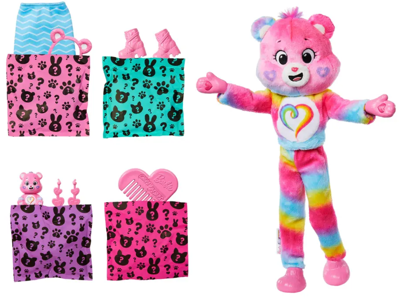 Le Barbie Cutie Reveal Care Bears nascondono dieci sorprese per un’esperienza di gioco tenera e divertente. All’interno della confezione si trova una bambola Barbie snodata travestita da uno dei personaggi Care Bears. Rimuovendo il morbido costume si scoprono vestiti e accessori come gonna, stivali, cerchietto, orecchini, pettine-spugna e un mini orsetto coordinato. La parte superiore del costume si trasforma in una giacca in pile, mentre la testa diventa un lettino per l’orsetto. Con l’acqua fredda o calda, il viso di Barbie cambia colore, regalando infinite trasformazioni e momenti di gioco pieni di dolcezza.