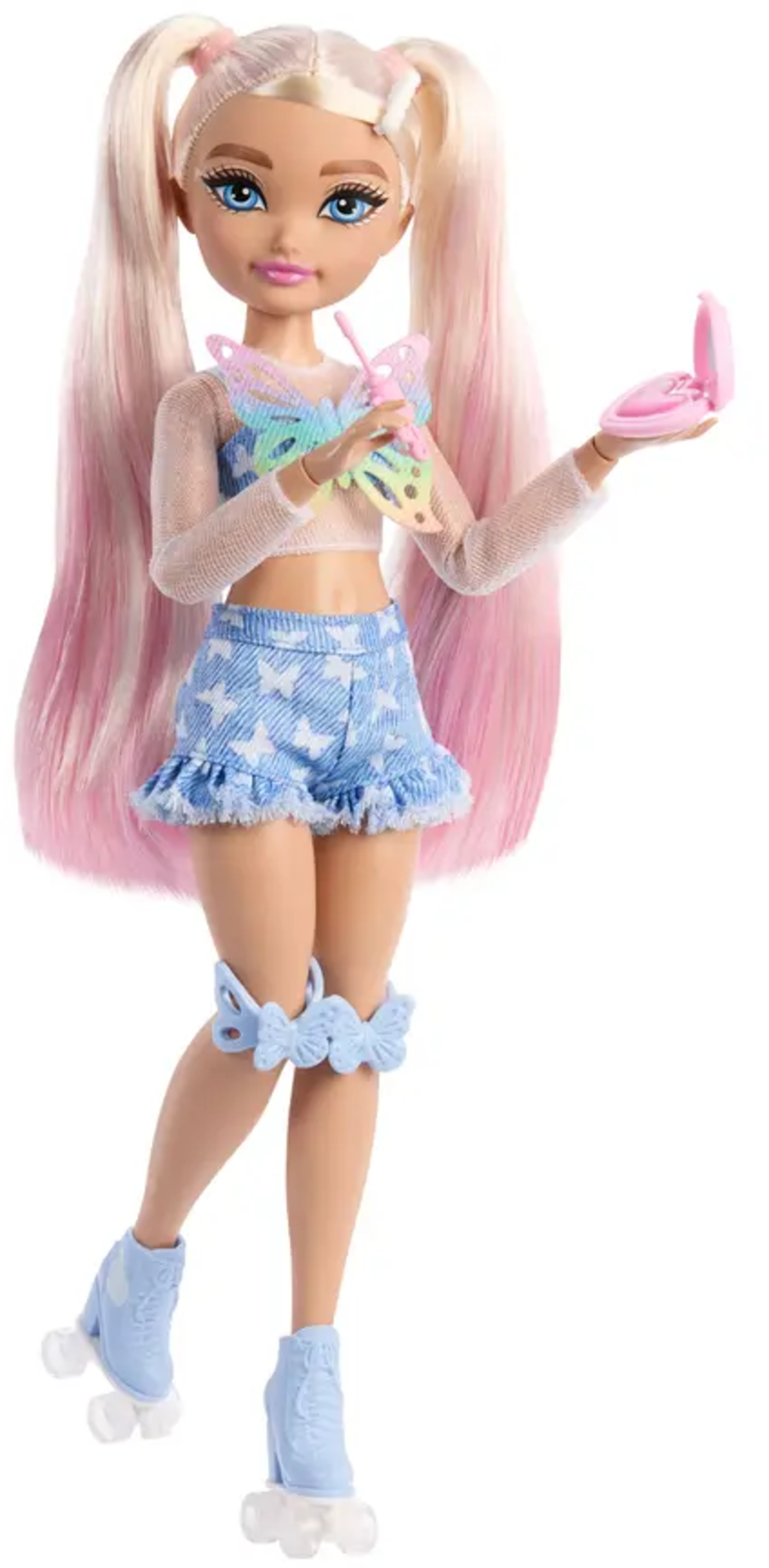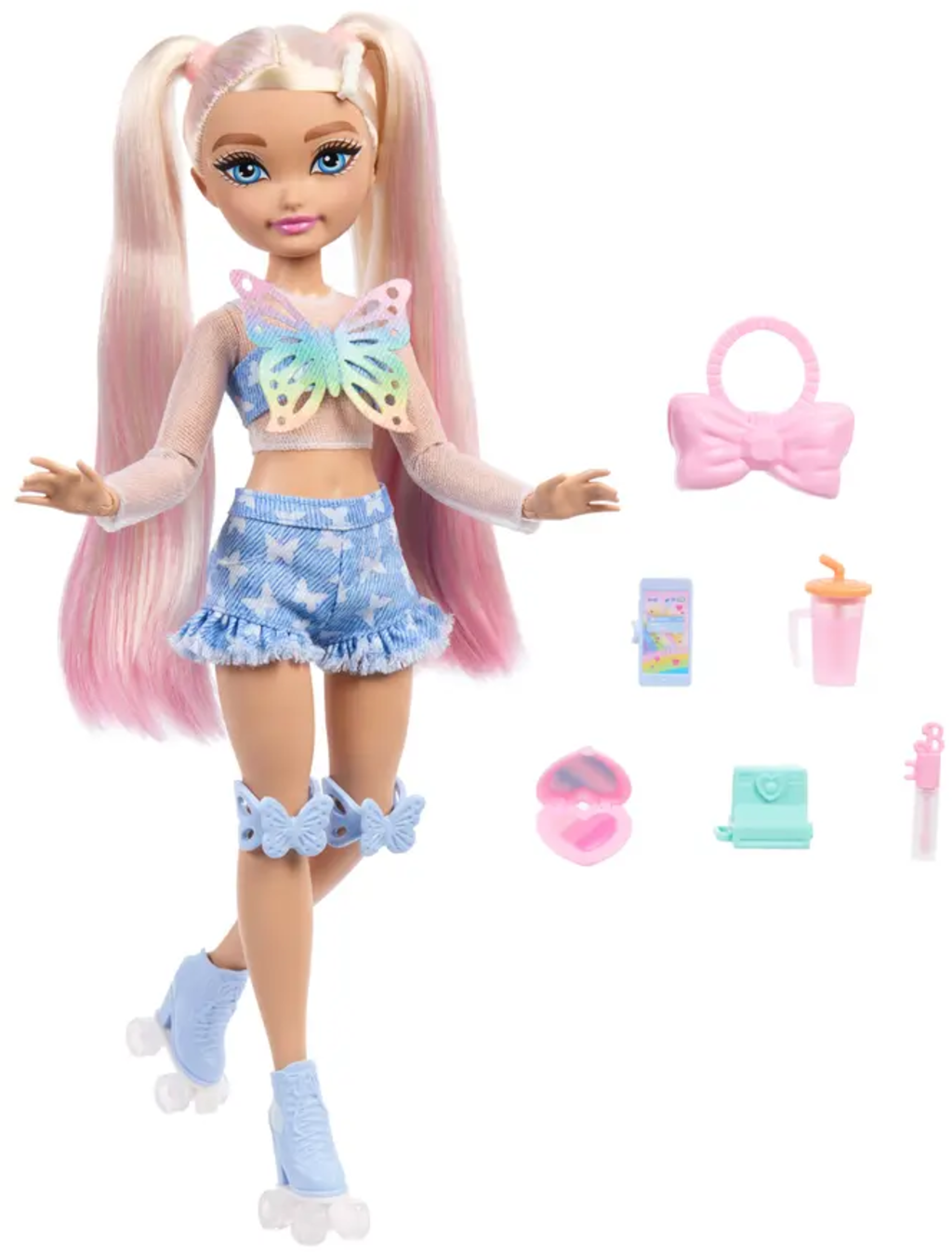 Barbie Malibu Dream Besties è pronta a sfrecciare sui pattini con un look ispirato alle farfalle, perfetto per il suo nuovo hobby. Indossa un top scintillante sopra una maglia bianca trasparente, shorts di jeans con dettagli a volant e pattini azzurri con piccole ali decorative. Barbie sogna di creare la propria linea di make-up e porta sempre con sé i suoi accessori preferiti: lucidalabbra, specchietto a forma di cuore, borsetta con fiocco, ginocchiere a tema farfalla, fotocamera, bevanda e telefono. I suoi lunghi capelli biondi con punte rosa, raccolti in due trecce, completano il suo stile unico e creativo.