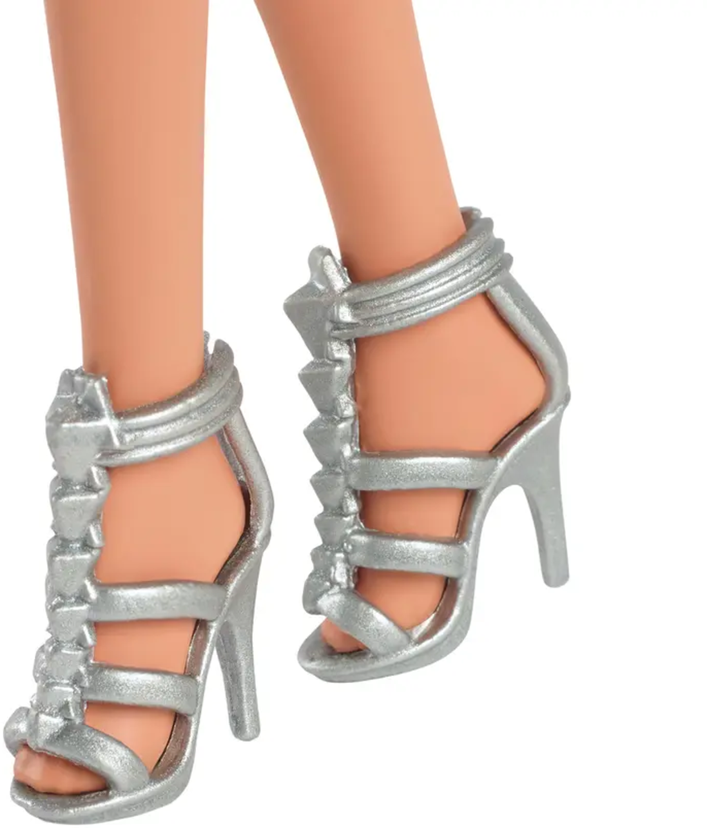 Questa bambola Barbie Fashionistas presenta un abito viola scintillante con paillettes e accessori argentati. I suoi morbidi capelli castani ondulati la rendono perfetta per giochi di moda creativi e avventure fantasiose.