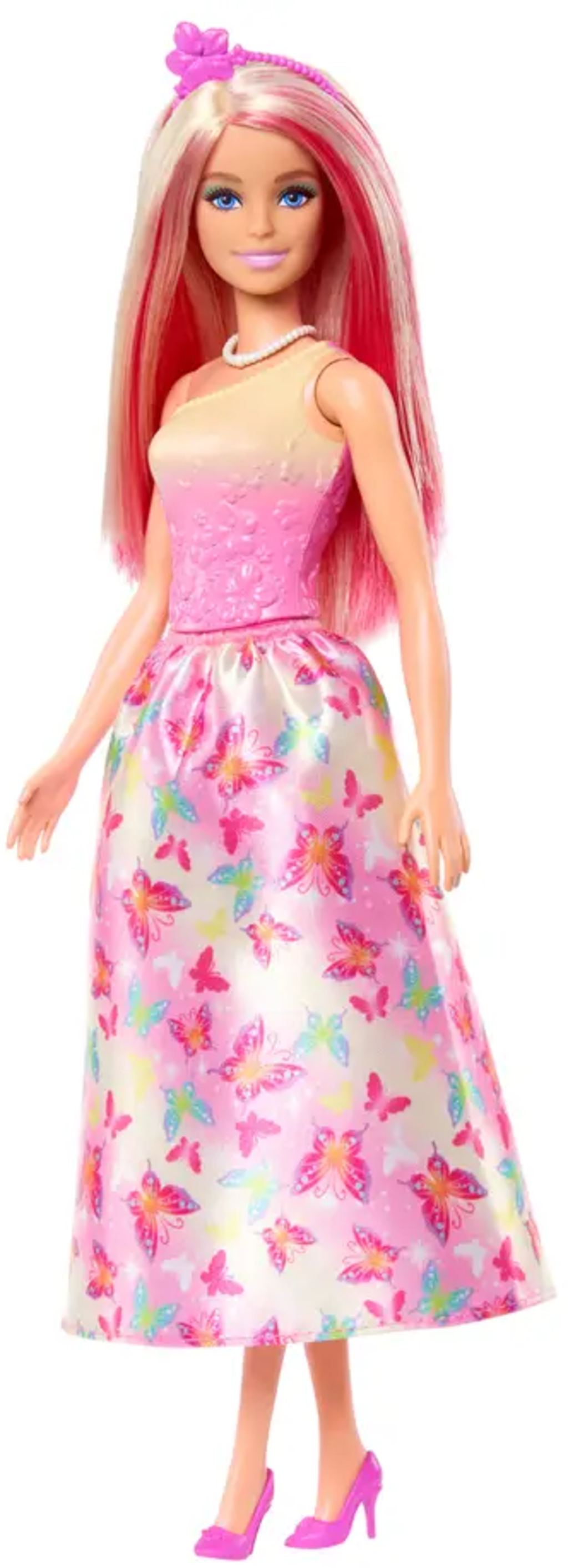 Vivi avventure fantasiose con questa bambola Barbie Royal! La sua gonna con motivo a farfalle, i capelli con riflessi biondo-rosa e gli accessori alla moda invitano al gioco creativo e alla narrazione.