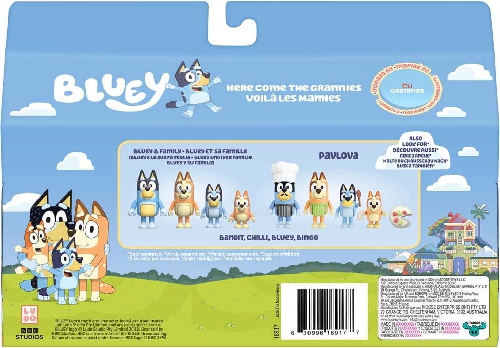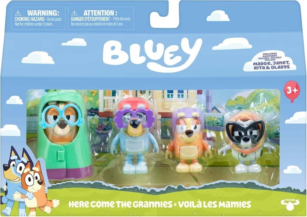 Dai vita a uno degli episodi più amati della serie. Il set di personaggi Bluey "Le nonne" include Chilli, Muffin, Bluey e Bingo nei loro indimenticabili ruoli di Madge, Gladys, Janet e Rita. Le figure, alte 7,5 cm, sono snodabili su braccia e busto e permettono un'esperienza di gioco particolarmente realistica.