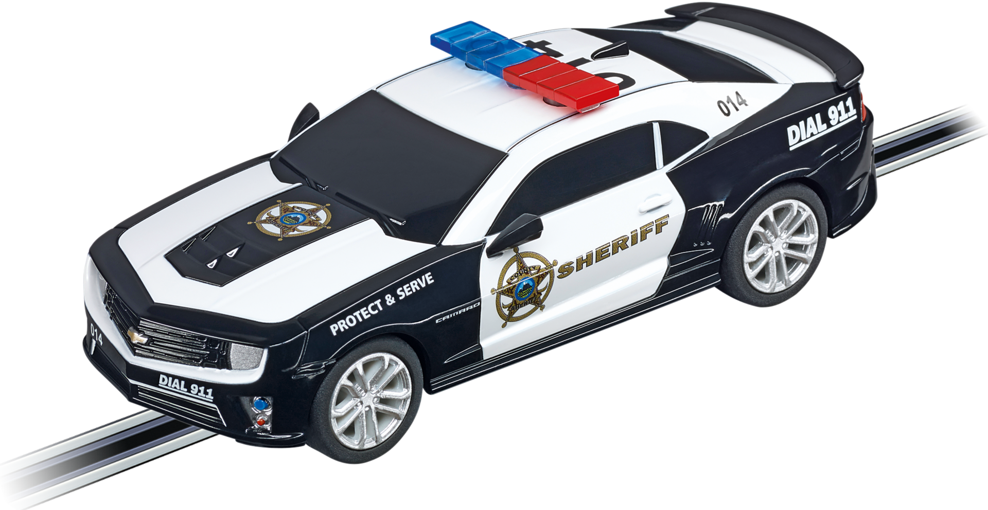 Il rapinatore tenta la fuga lungo la pista Carrera. Subito la pattuglia Chevrolet Camaro "Sheriff" parte all’inseguimento. Con le luci lampeggianti e le gomme che fischiano sfreccia sul tracciato. Riuscirà a raggiungere l’auto in fuga e catturare il ladro?