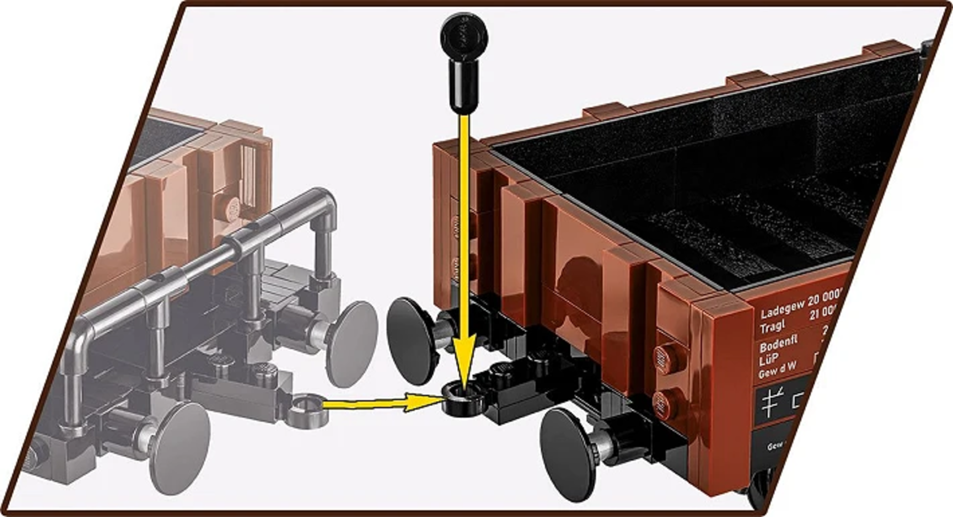 Espandi il tuo impero ferroviario e fai partire i treni! Con questo vagone merci in scala 1:35, altamente dettagliato, ora puoi trasportare tutto ciò che è importante nel tuo mondo di gioco: carbone, casse o persino piccoli veicoli. Grazie all'ingegnoso sistema di collegamento, puoi agganciare il vagone alle tue locomotive in pochissimo tempo e assemblare il tuo treno personalizzato.