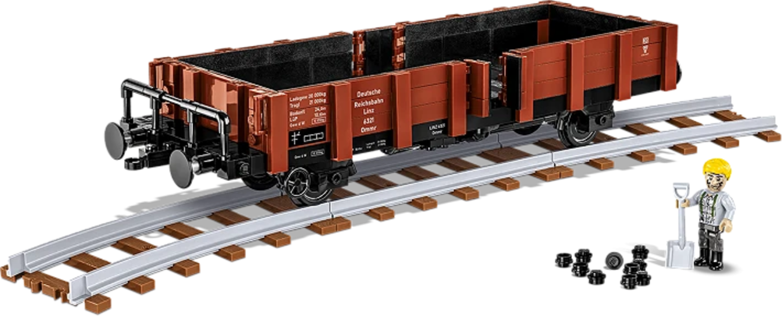 Inclusi non solo un operaio con pala e mattoni di carbone abbinati, ma anche moderni elementi di binario con un effetto legno incredibilmente realistico. Le stampe di alta qualità assicurano che il tuo vagone sembri ancora nuovo anche dopo molti viaggi. Posa i binari, carica il pianale e inizia la tua prossima grande avventura logistica su rotaia!
