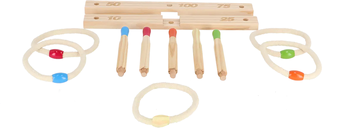 Questo classico gioco di abilità garantisce divertimento in giardino ed è un successo non solo alle feste di compleanno. Chi riesce a far atterrare gli anelli sui diversi pioli?