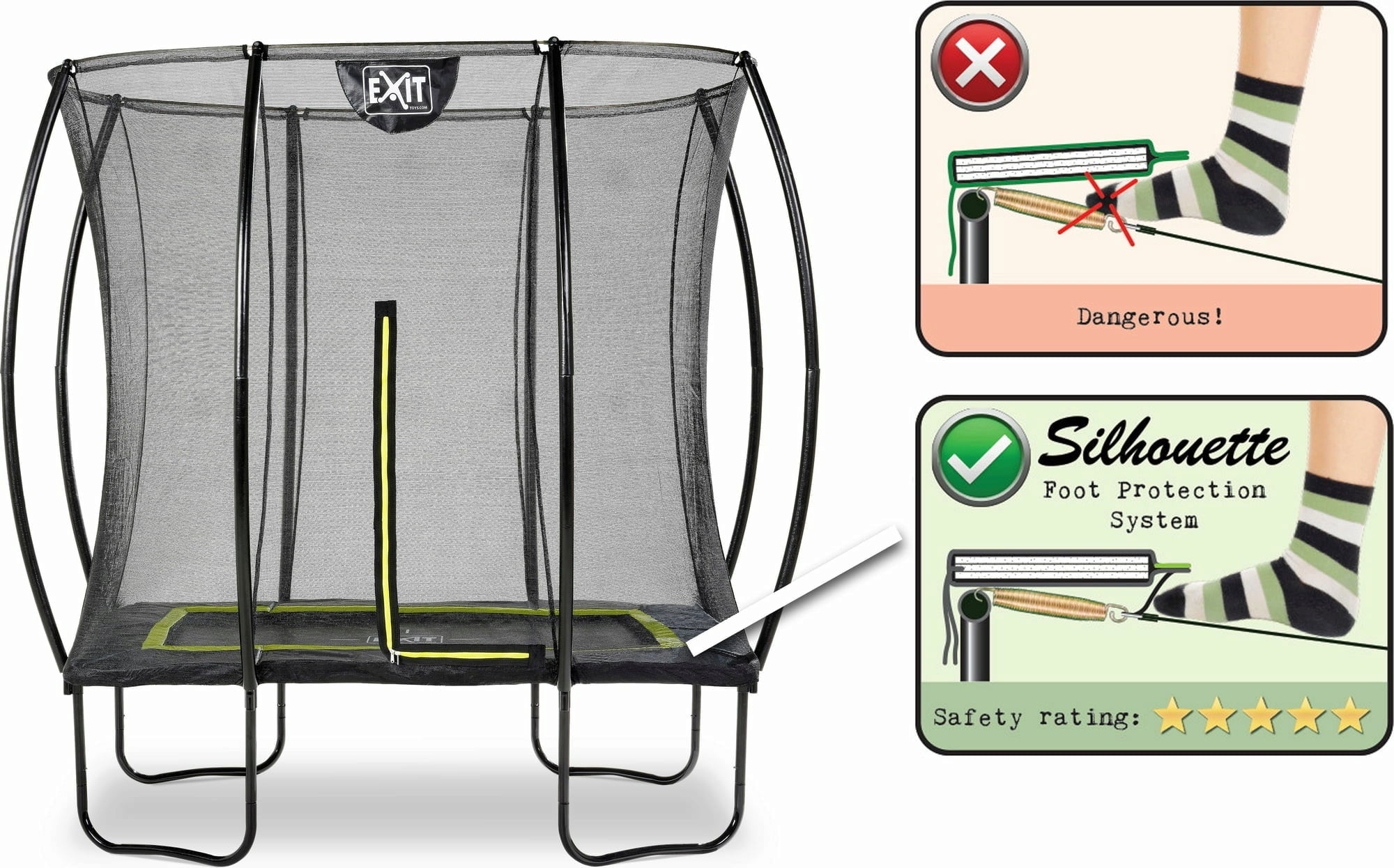 Con quattro piedini a W in metallo, il trampolino Silhouette di EXIT Toys offre un buon rimbalzo e ore di incredibile divertimento. Una rete, ben tesa su otto montanti esterni, garantisce assoluta sicurezza durante il salto. Il bordo di protezione nero copre perfettamente le molle e, grazie al sistema di protezione del piede, evita che i piedi rimangano impigliati tra le molle. Il telaio del trampolino è resistente alla ruggine e a tutte le condizioni atmosferiche.