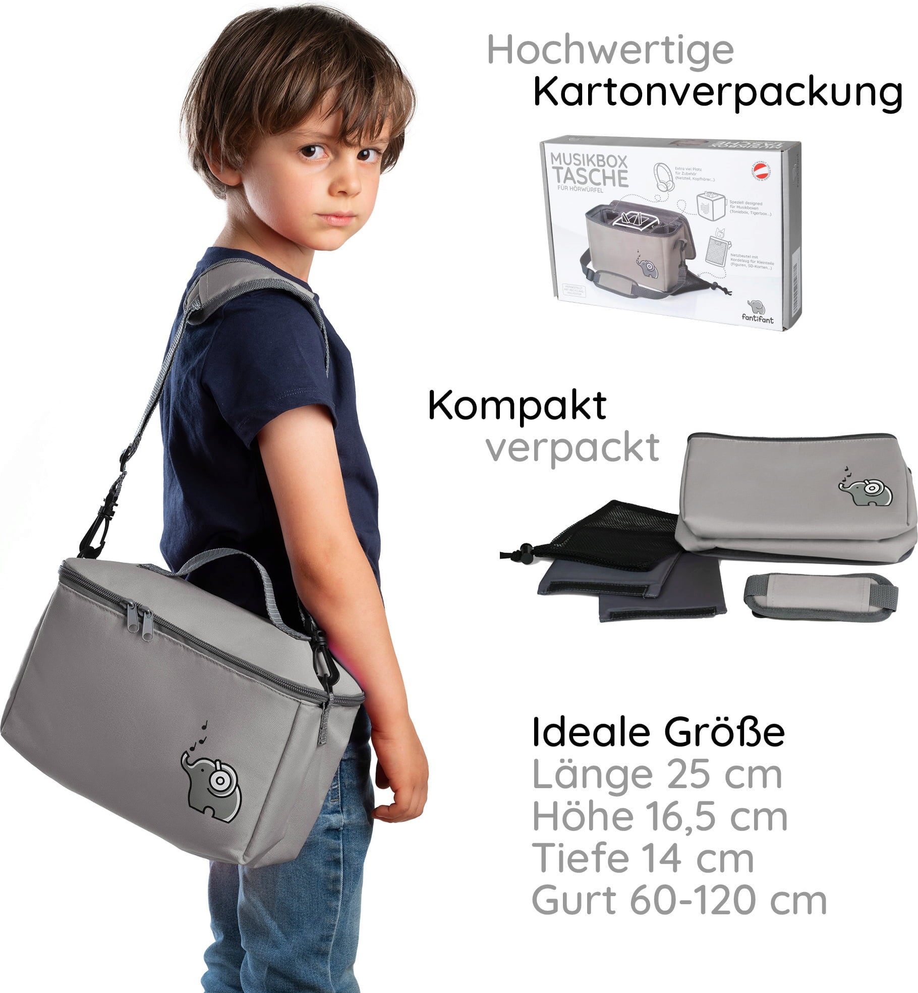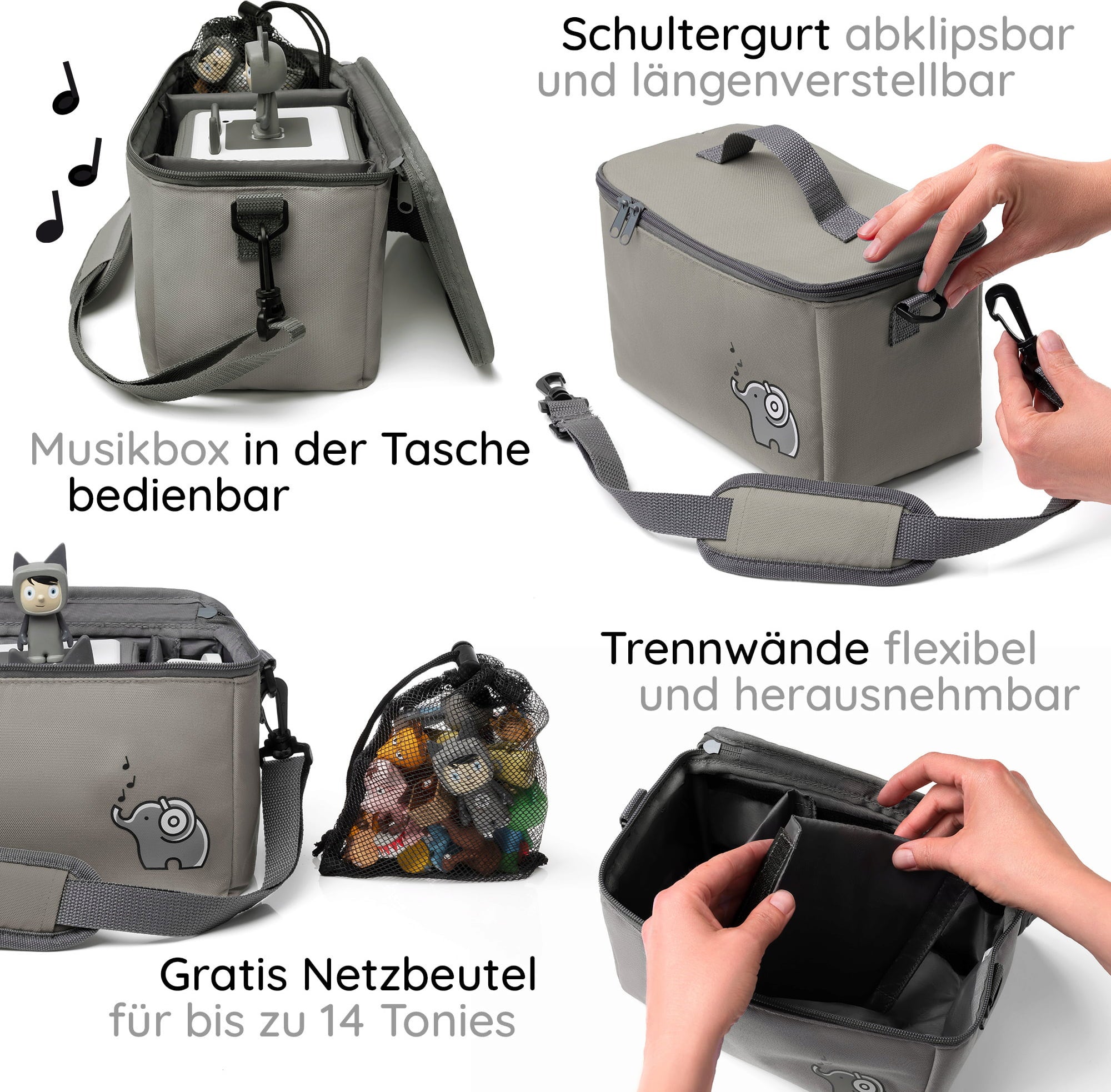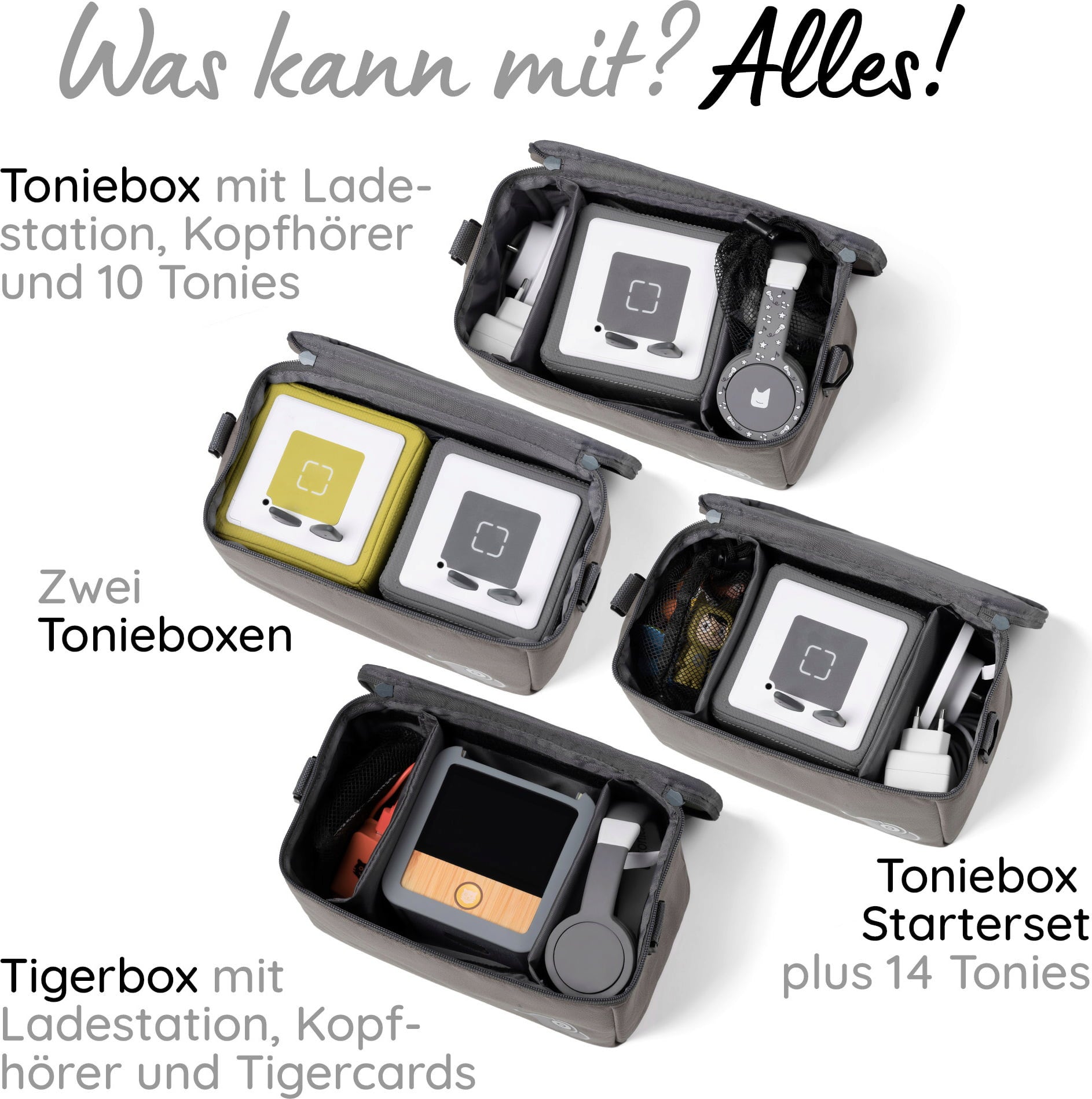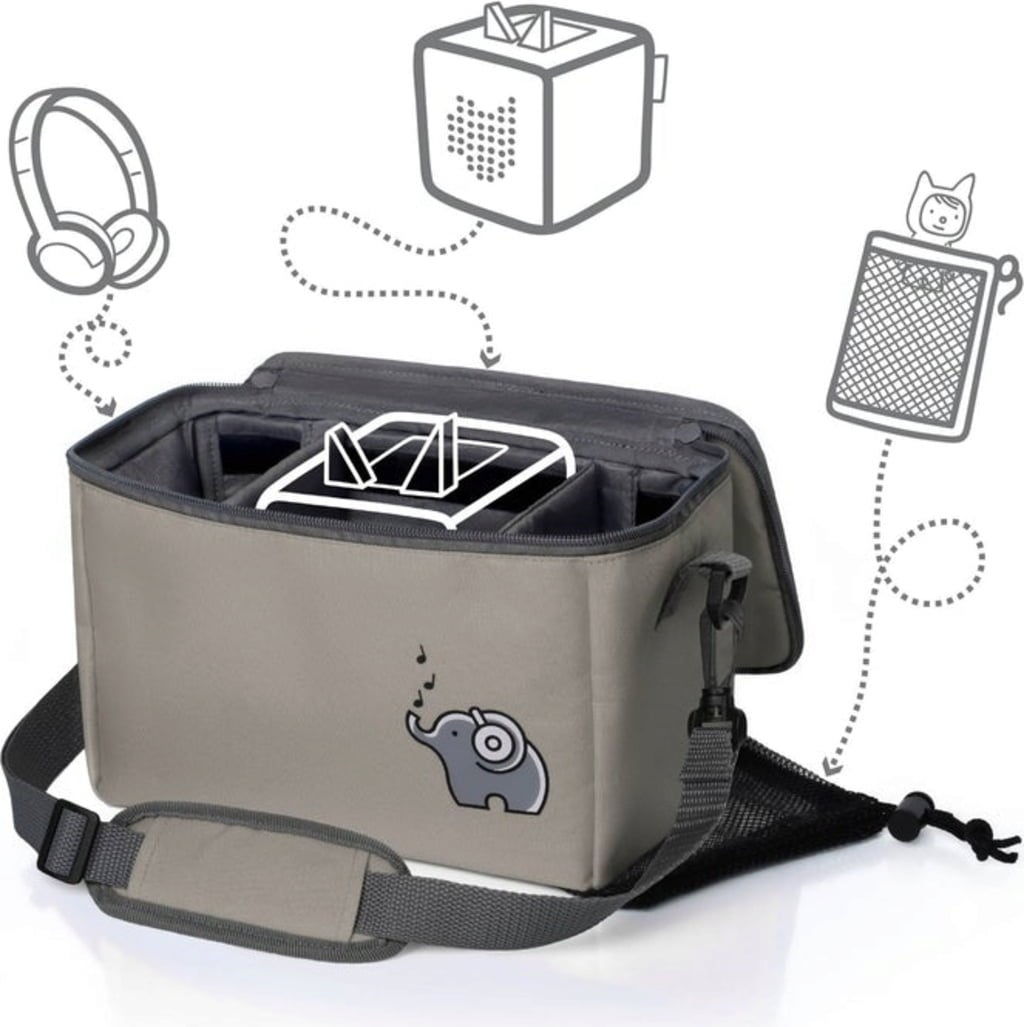 Borsa colorata con tanto spazio per la Toniebox e i tuoi personaggi preferiti. La borsa a rete inclusa offre ulteriore spazio per altri accessori. La dimensione degli scomparti interni può essere regolata tramite cinturini in velcro. Il coperchio può essere aperto completamente e permette di usare la Toniebox anche nella borsa.