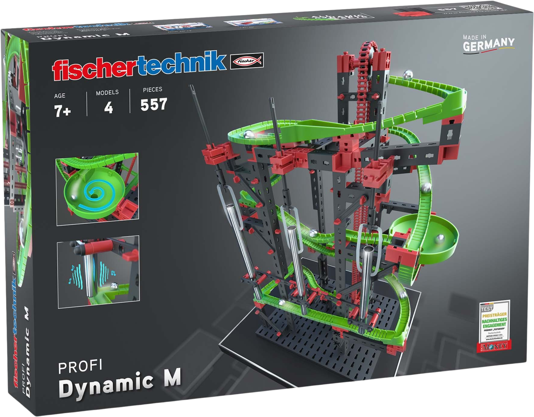 Con PROFI Dynamic M ogni pista per biglie diventa un'avventura. Le biglie attraversano curve strette, saltano da una rampa all'altra ed emettono melodie quando toccano i tubi sonori. Il vortice e lo scambio aggiungono ancora più sorprese ai percorsi. Con quattro modelli già pronti da ricostruire o con percorsi creati liberamente i bambini vivono un divertimento senza fine e imparano in modo intuitivo come funzionano i movimenti meccanici.