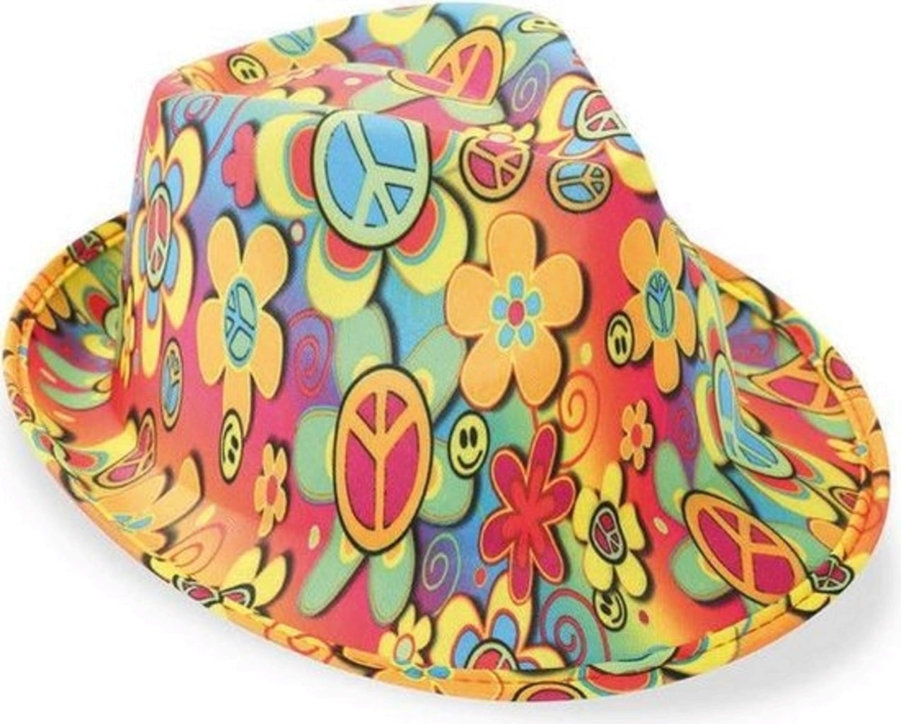 Copricapo vistoso con simboli di pace, fiori e faccine in colori vivaci e folli.