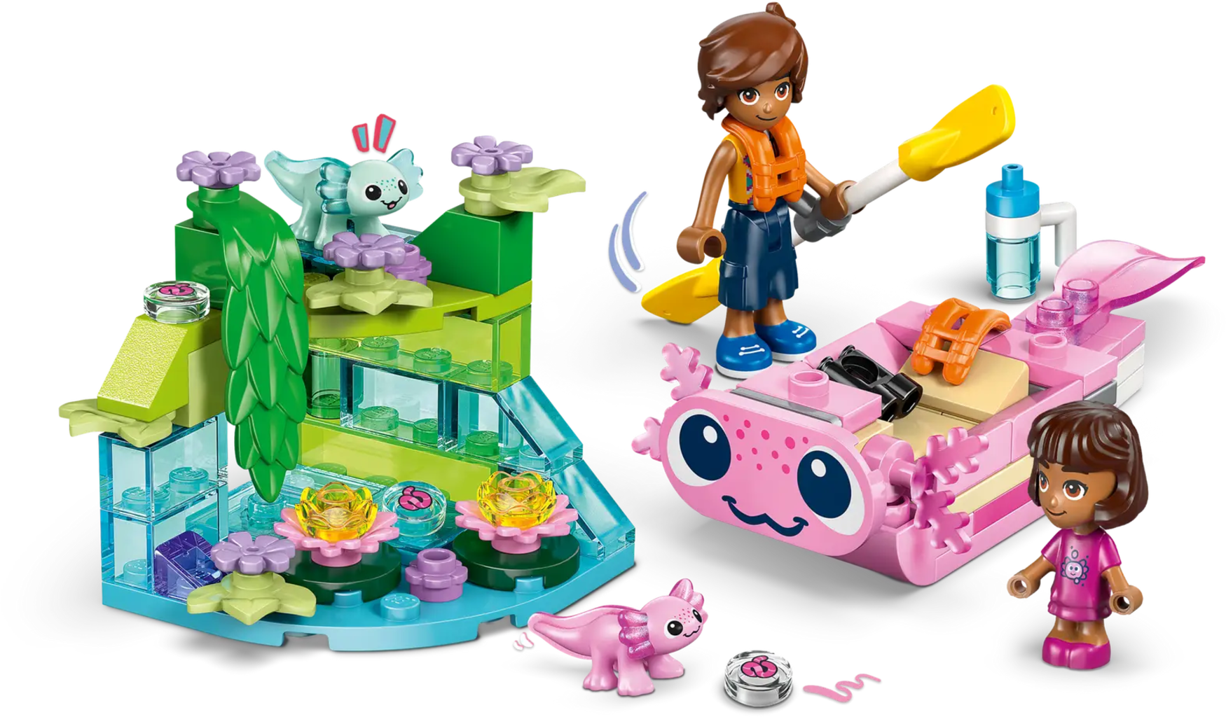 Playset LEGO Friends Barca d’avventura Axolotl per bambini dai 5 anni, con una simpatica barca a tema assolotto, 2 personaggi e mini-assolotti per inventare storie di esplorazione nella natura.