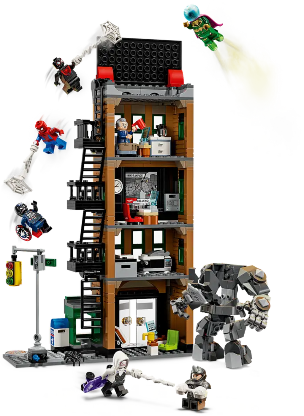 Set LEGO® ǀ Marvel Spider-Man vs. Mysterio: il Daily Bugle (76342) con edificio a 4 livelli, 7 minifigure iconiche e mech di Rhino, ideale per gioco ed esposizione. Ricco di dettagli interni ed esterni per ricreare epiche scene d’azione.