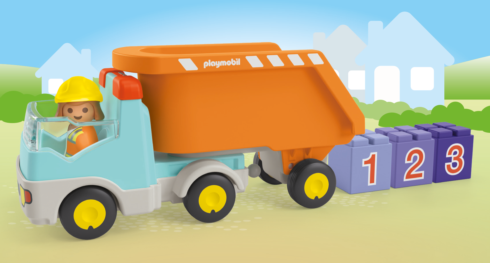 Accessori: 1 autocarro con cassone ribaltabile, 3 mattoncini da costruzione