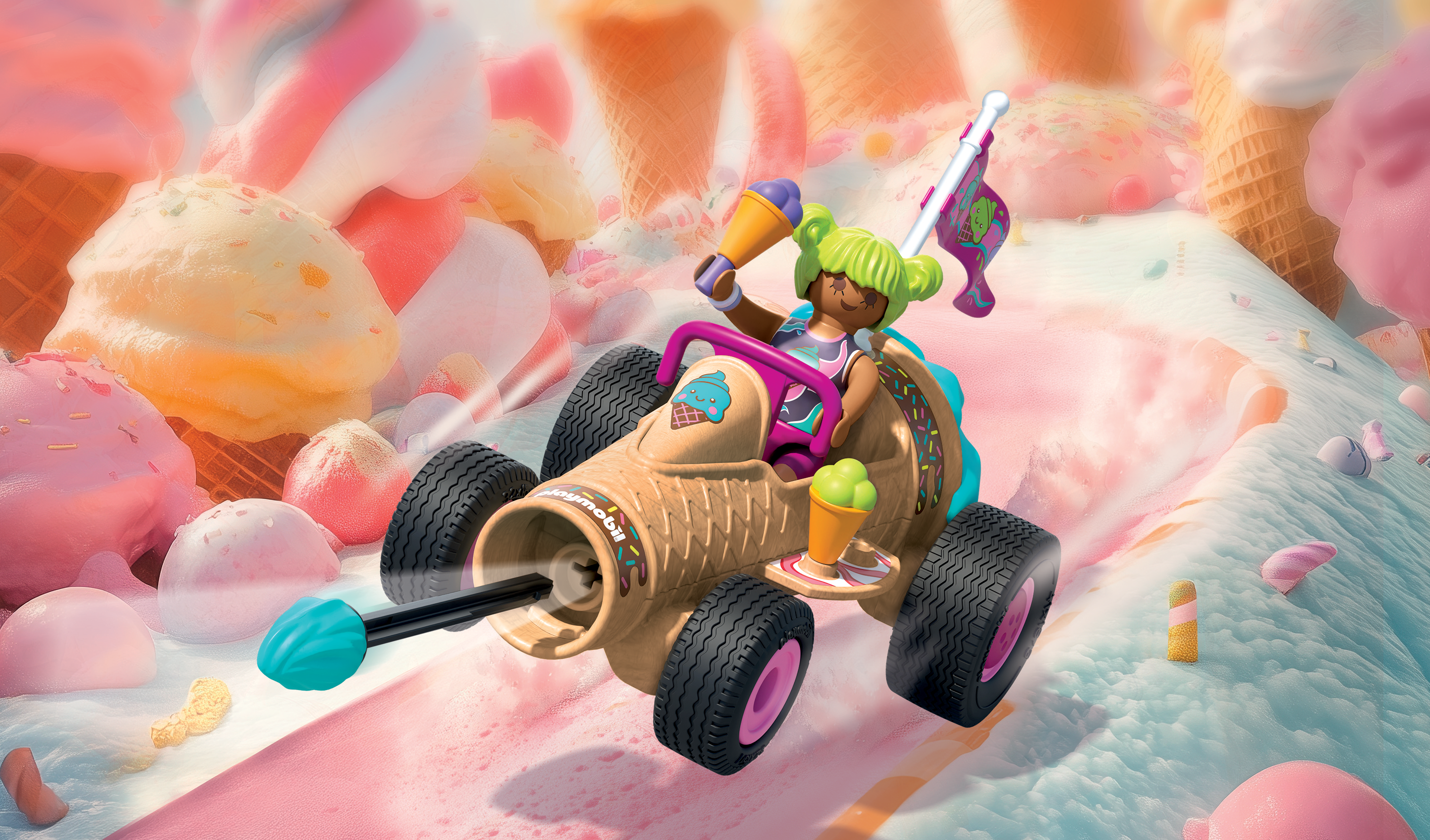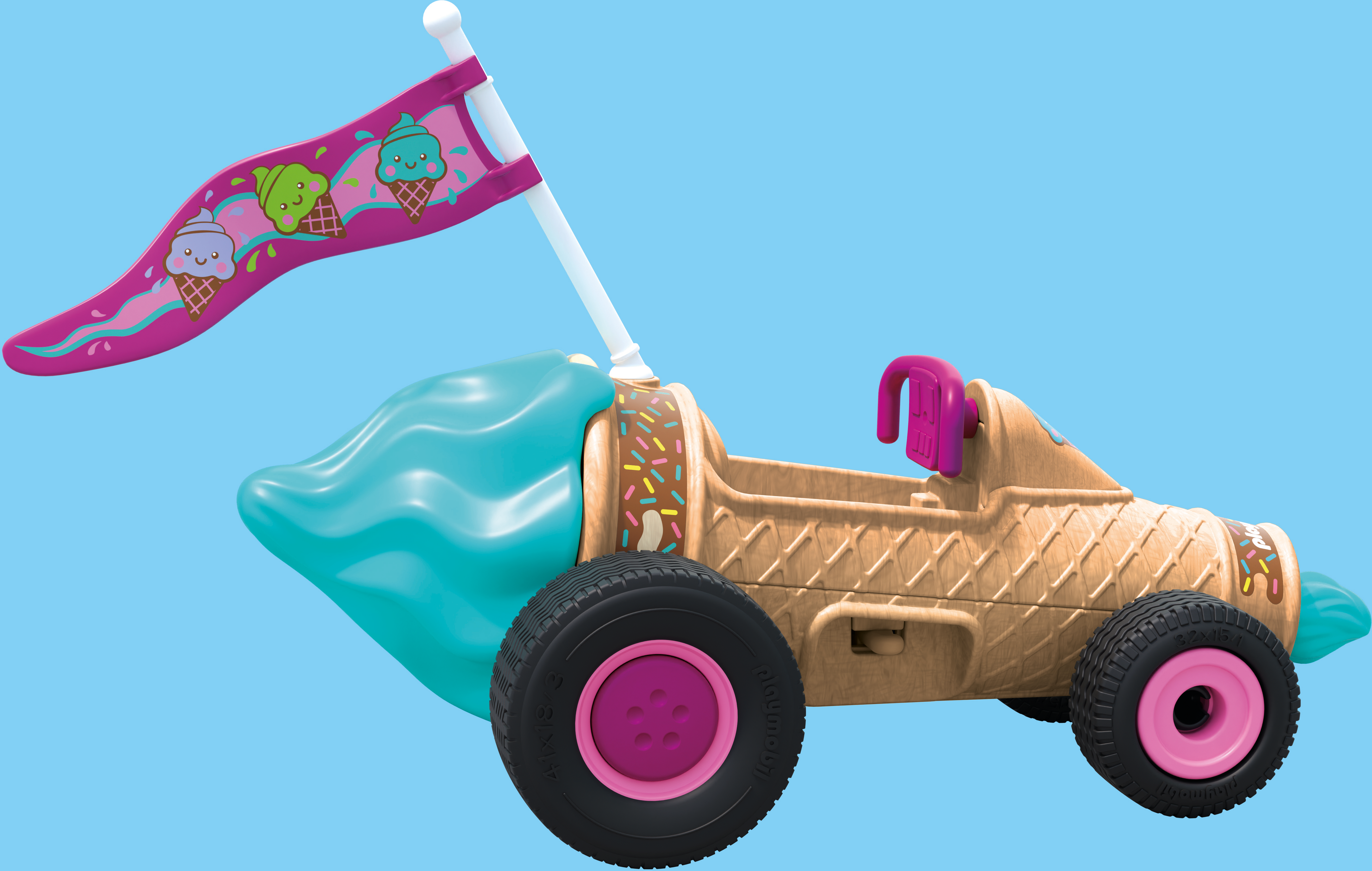 Con questo veicolo a forma di cono gelato ogni gara si trasforma in una dolce sfida. Il venditore di gelati guida il veicolo a forma di cono, completo di cannone per sparare proiettili di gelato, coni e bandiera, attraverso l'arena dei dessert. Perfetto per giochi di ruolo creativi, battaglie a squadre e un sacco di risate!