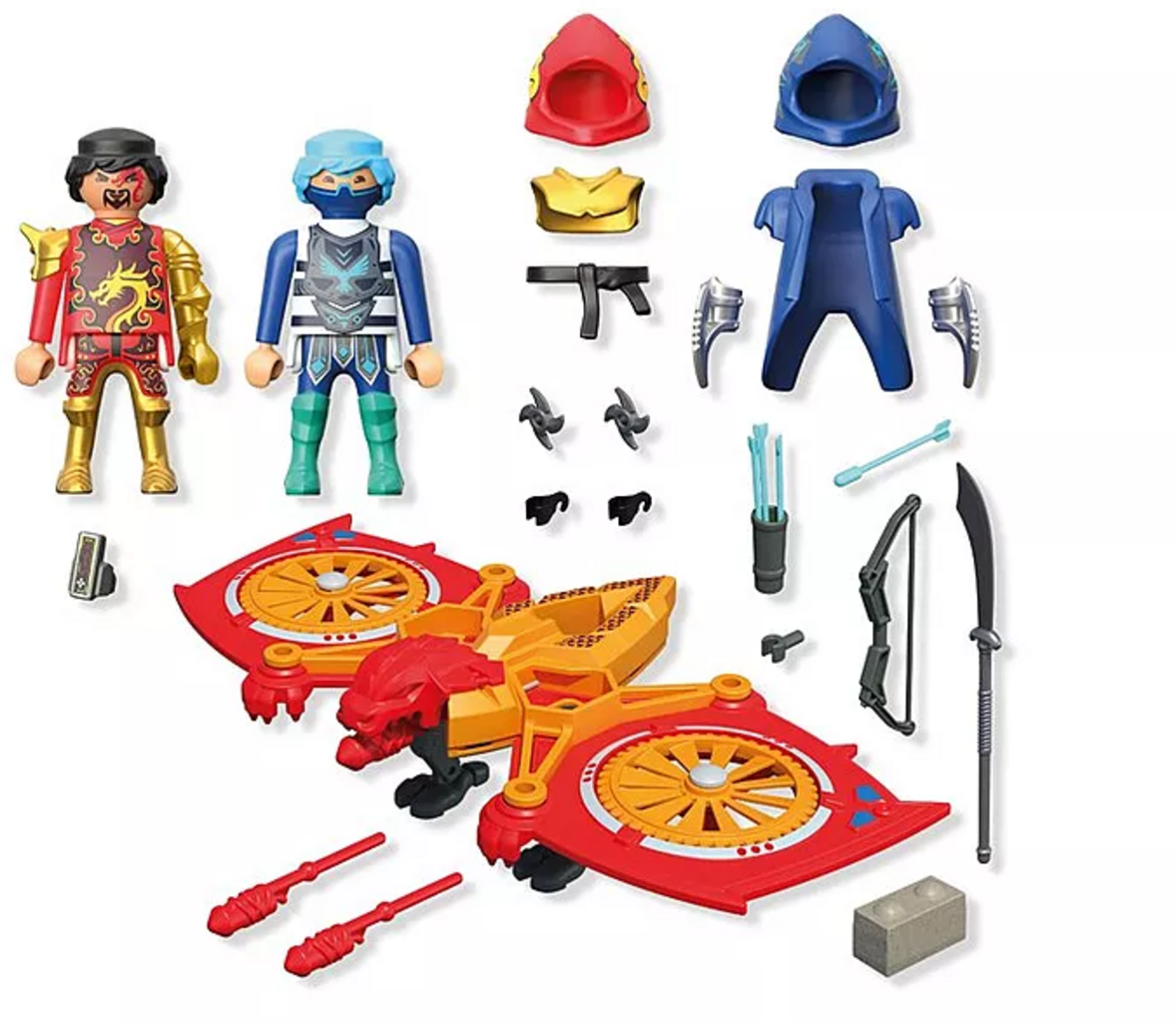 Sopra il campo di battaglia, il drone drago piomba in picchiata con ali rotanti e proiettili automatici! L’Eroe combatte dall’alto, mentre l’avversario difende la sua base con armi ninja e grande prontezza. Grazie al muro distruttibile, all’'rco e a tanti strumenti potenti, i bambini possono inventare infinite avventure di arti marziali con questo playset PLAYMOBIL Heroes ricco di accessori e due combattenti.