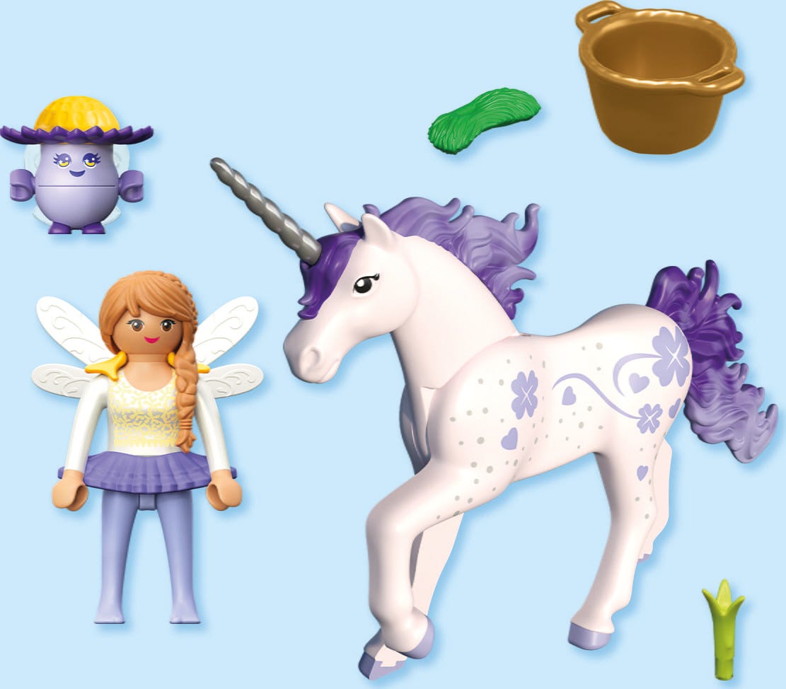 Contenuto: 1 donna, 1 Joyling, 1 unicorno, 1 cestino, 3 fasci di fieno, 2 ali, 1 colletto ad ali, 1 cappello per bambini, 1 piccola coppia di ali