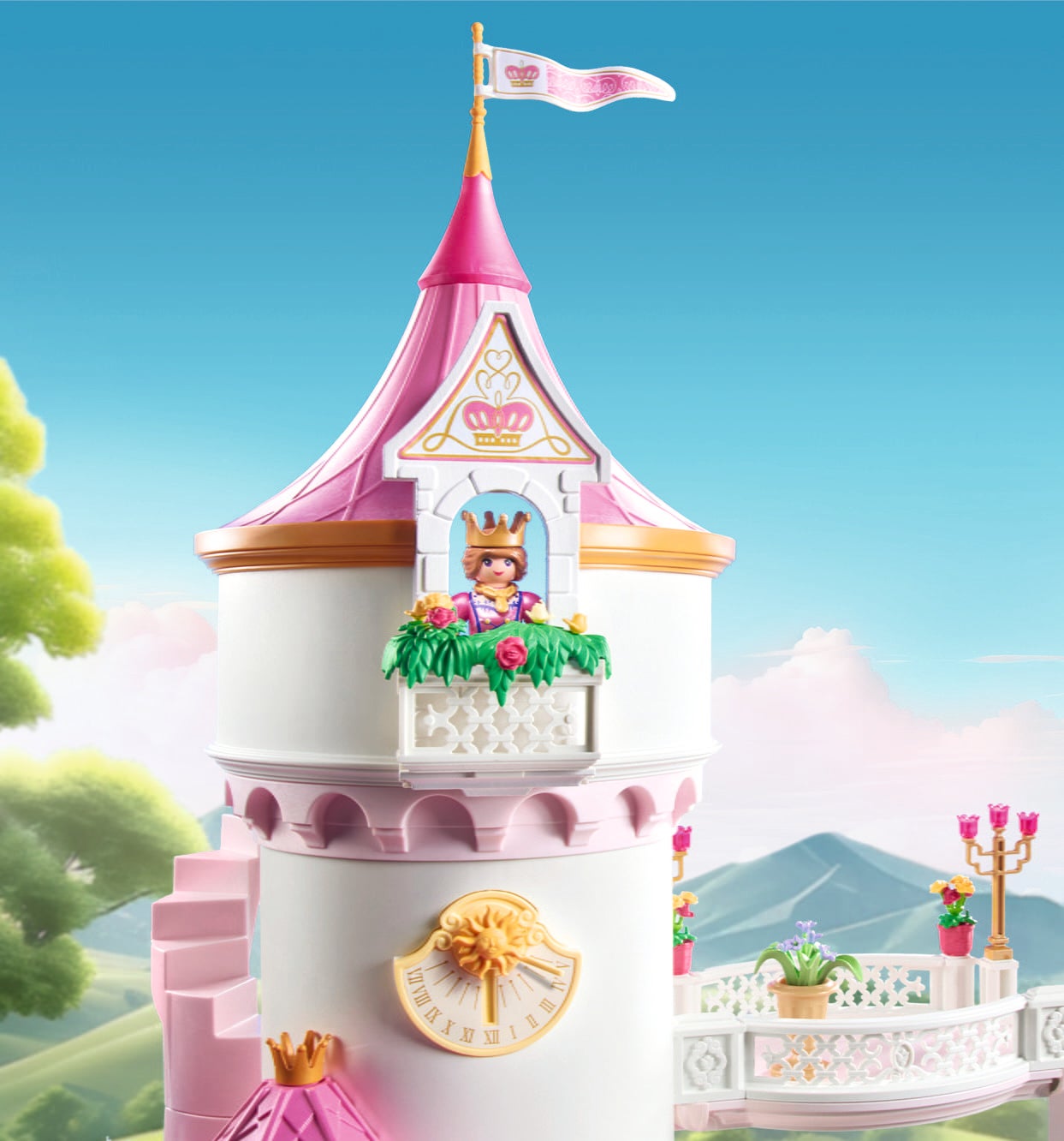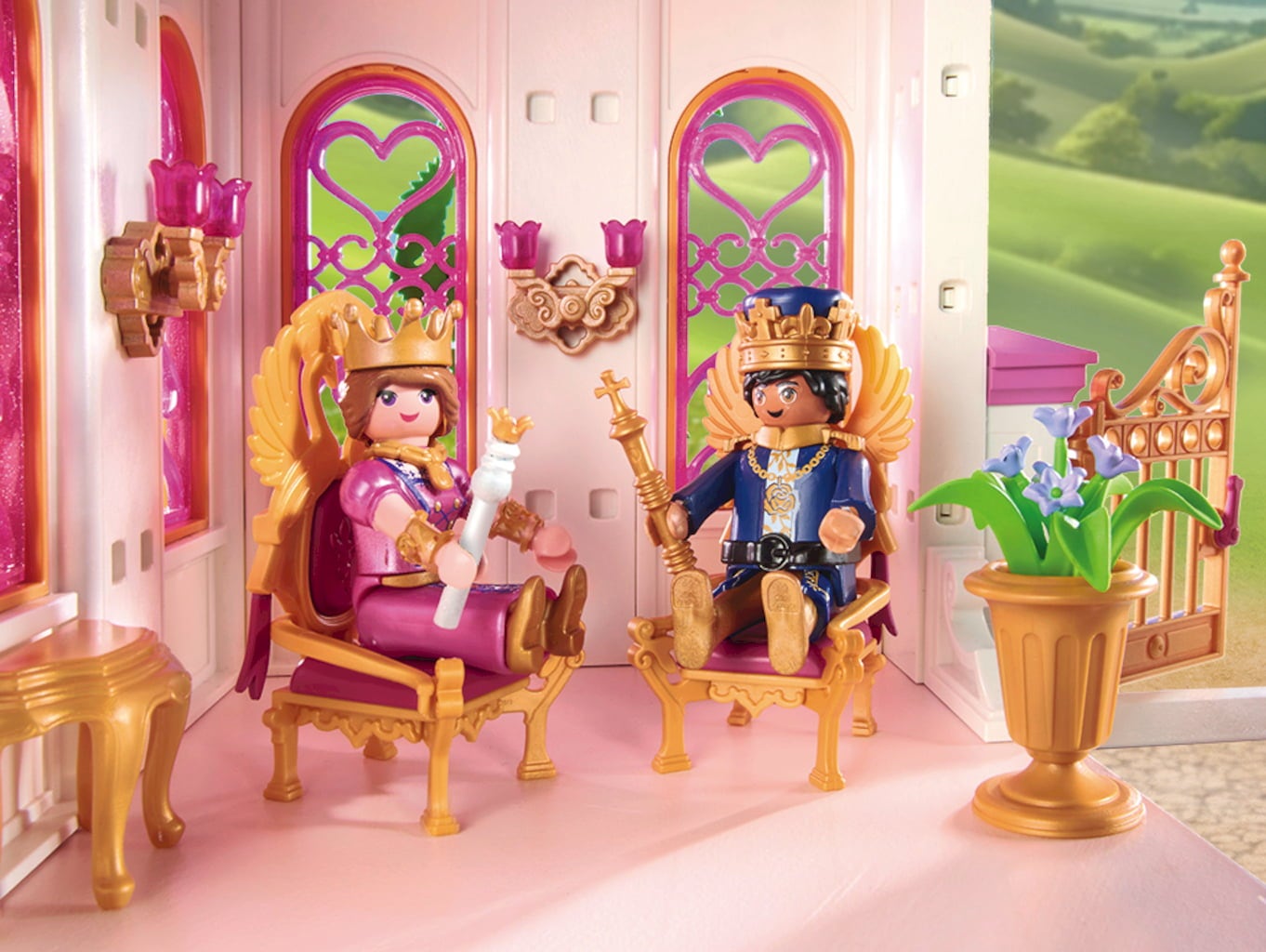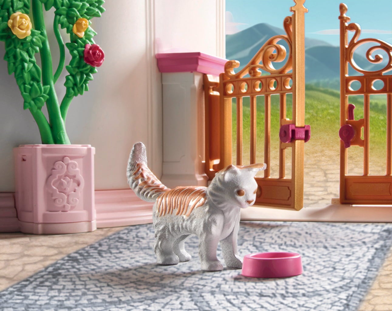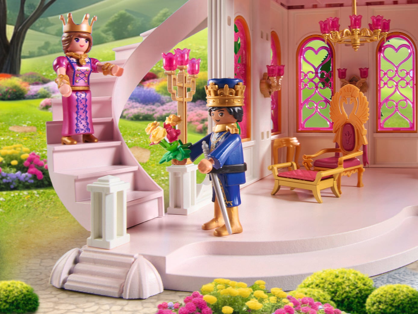 Contenuto: 1 regina, 1 re, 1 gatto persiano, 1 castello da principessa con meridiana e piante, 1 vaso da fiori grande con pianta fiorita, 6 vasi da fiori con fiori, 1 lampadario, 1 tavolino, 2 troni, 2 piatti rotanti, 2 torce in piedi, 1 sgabello, 2 bandiere, 1 bandierina, 2 corone, 1 spada, 2 scettri, 1 gonna a cerchio con cuori e fiocco, 2 polsini per le braccia, 1 collana, ciotola per la pappa.