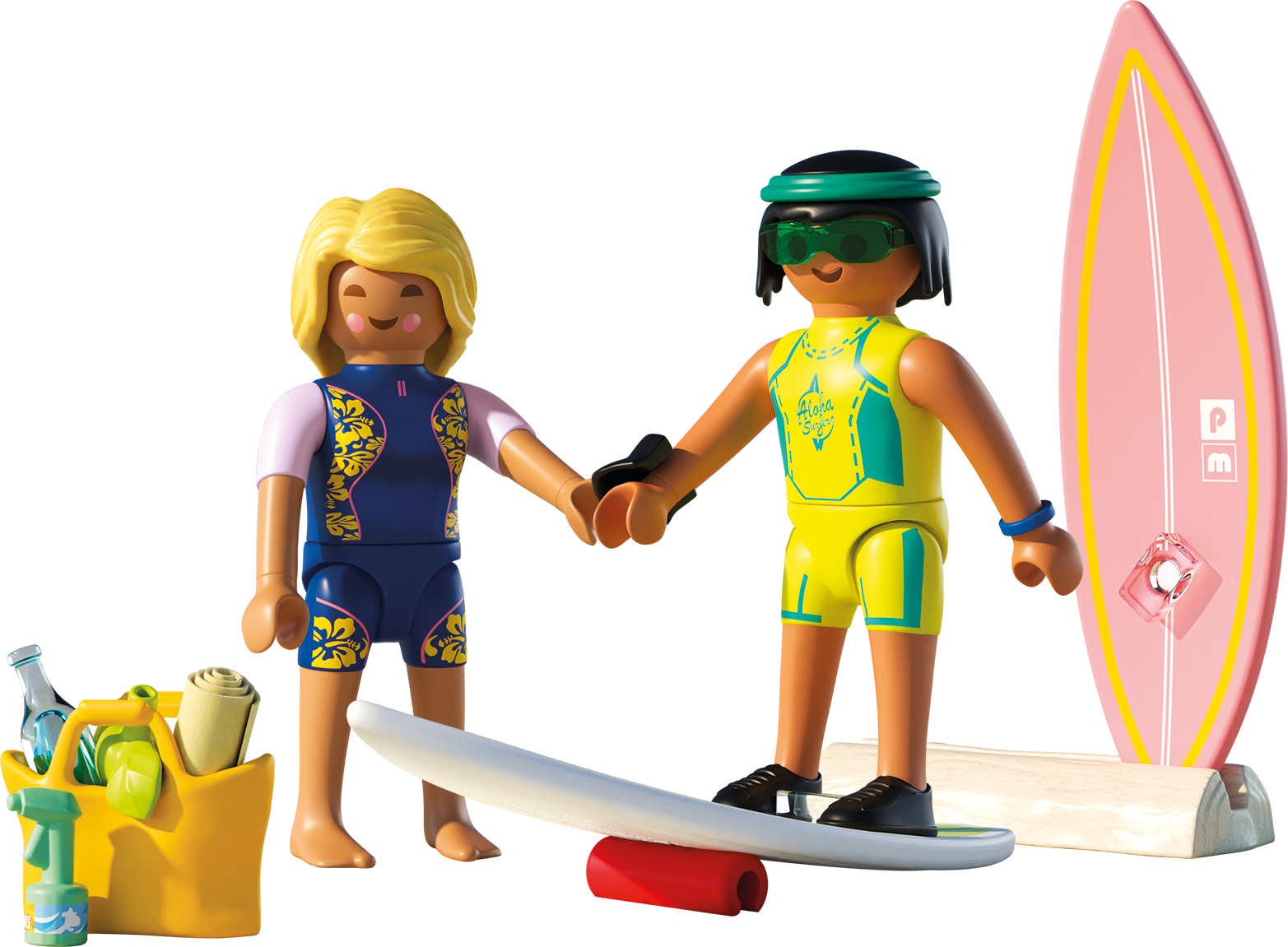 Contenuto: 1 uomo con occhiali da sole e fascia, 1 donna, 2 tavole da surf, 1 supporto per tavole da surf, 1 rotolo per l'allenamento di surf, 1 borsa da spiaggia con asciugamano e bottiglie.
