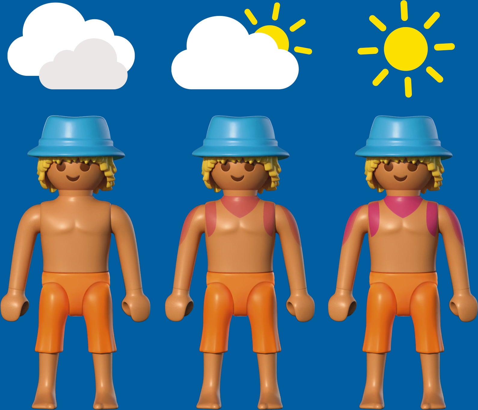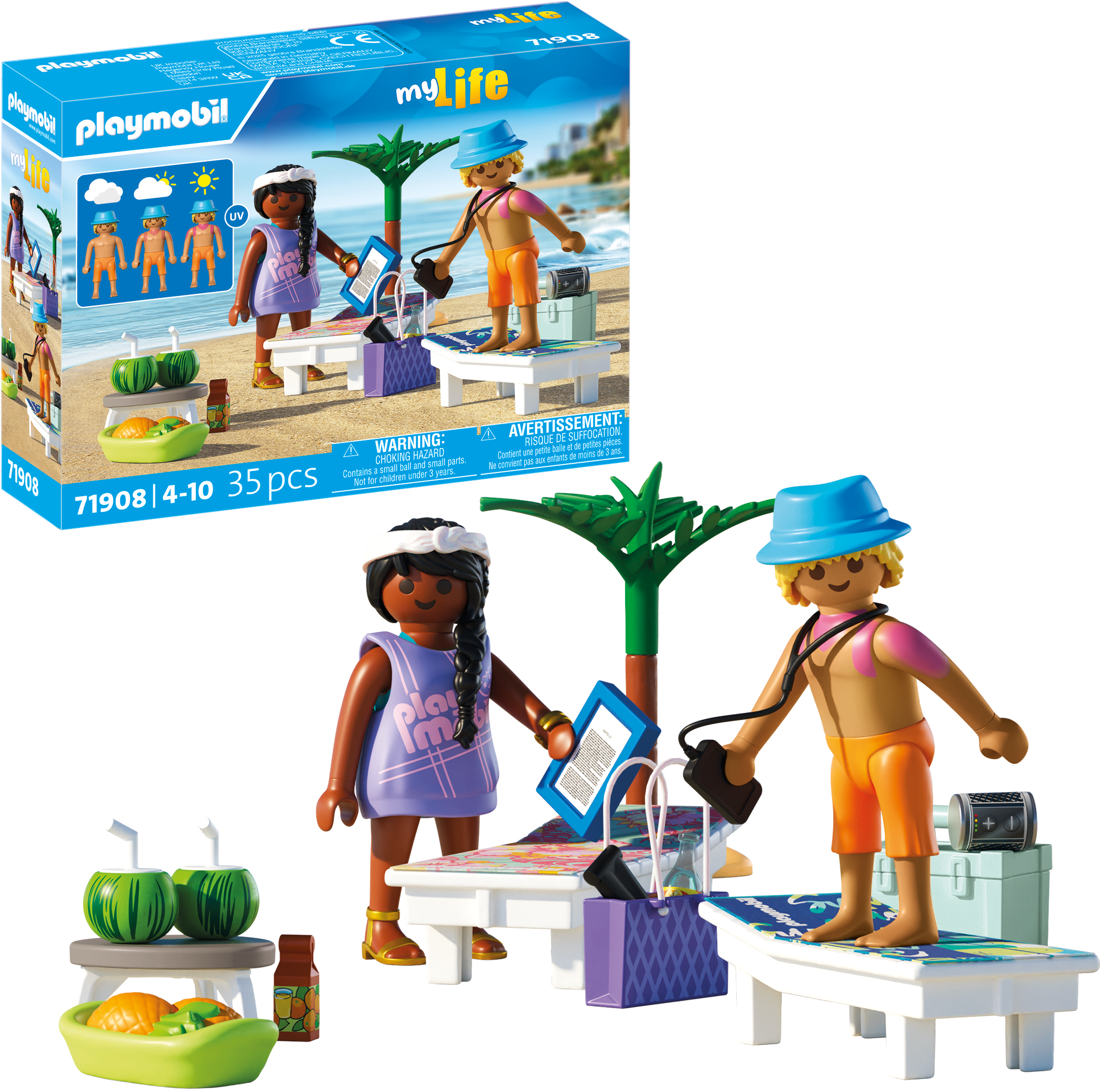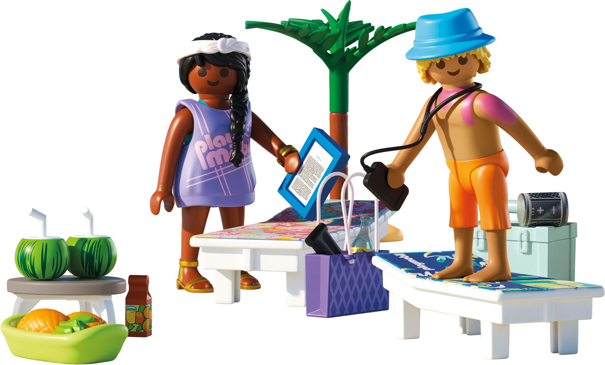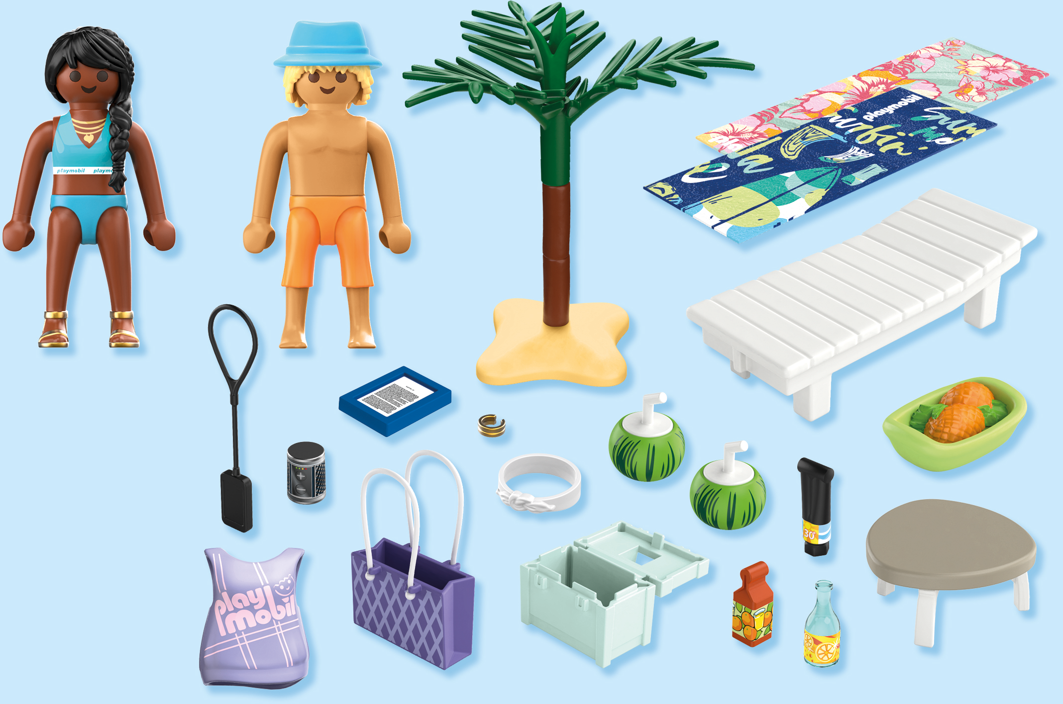 Contenuto: 1 uomo con cappello, 1 donna con vestiti intercambiabili, 2 lettini, 2 asciugamani di stoffa, 1 palma, 1 tavolino, 2 bevande all'anguria, 1 ciotola di ananas, 1 borsa da spiaggia, 1 rivista, 1 borsa frigo con bevande, 1 braccialetto, 1 lettore MP3, 1 crema solare
