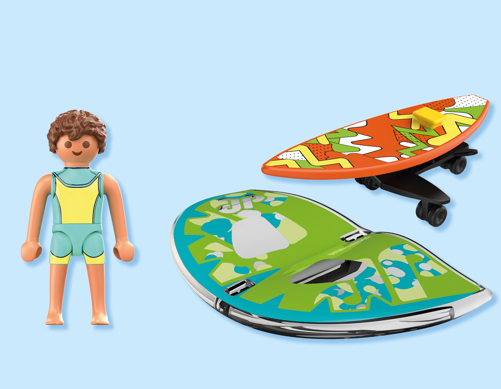 Contenuto: 1 surfista, 1 ala con maniglia, 1 tavola foil con ruote