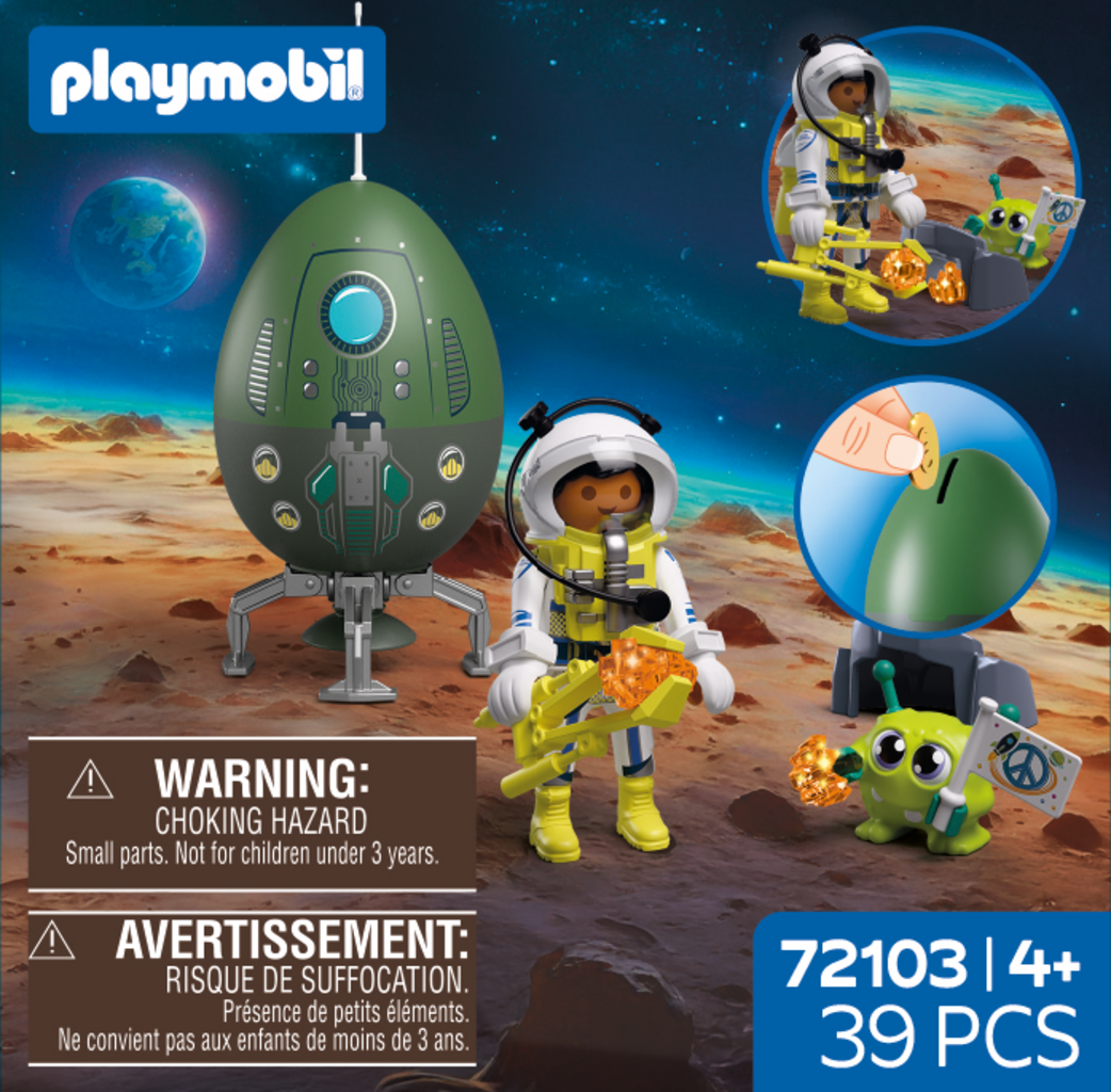 Destinazione: spazio! L'Uovo Gioco: Spazio di PLAYMOBIL permette ai bambini di esplorare pianeti alieni: un astronauta incontra un alieno amichevole, si meraviglia di fronte a cristalli luminosi e vive incontri pacifici pieni di fantasia.