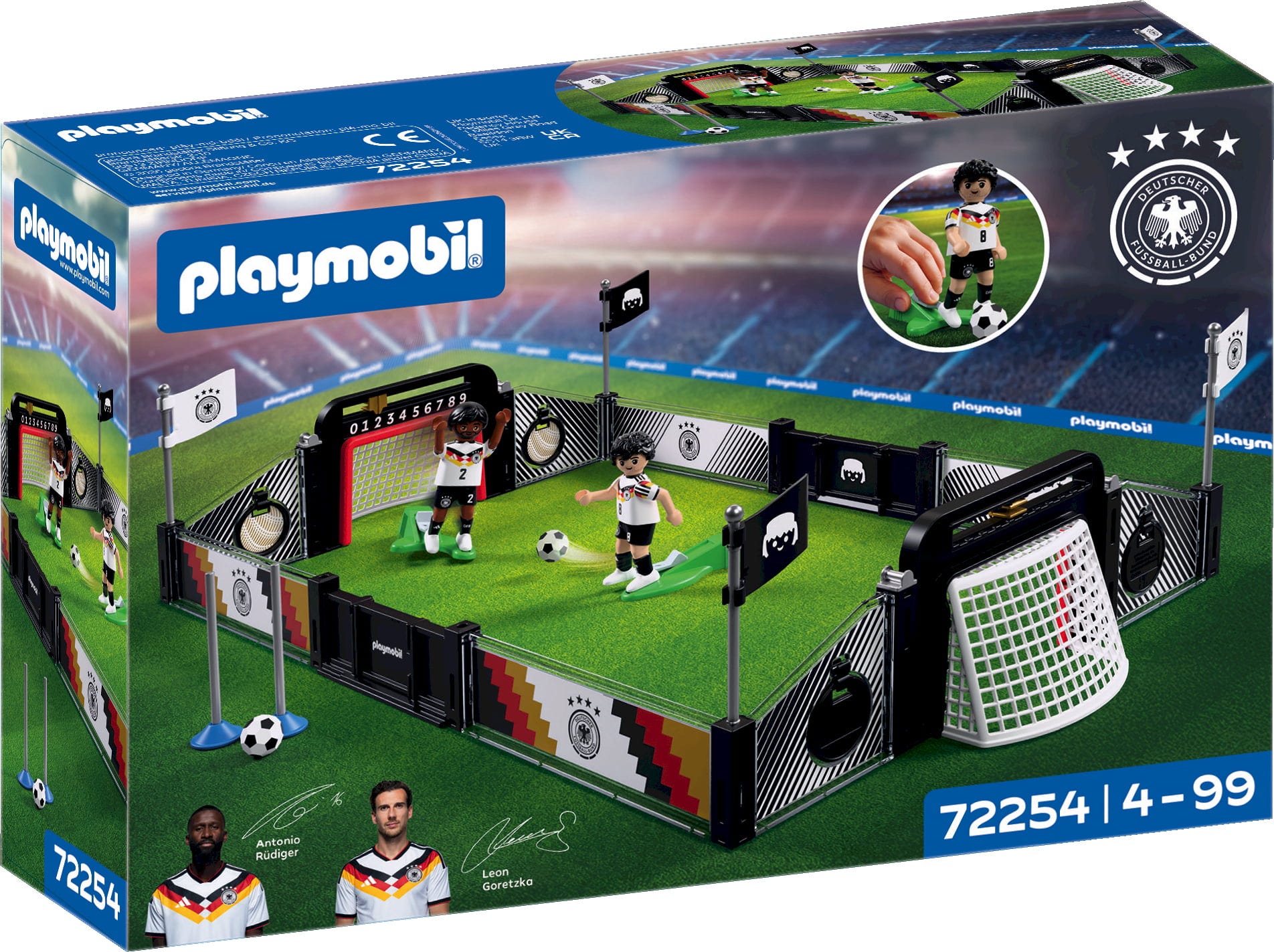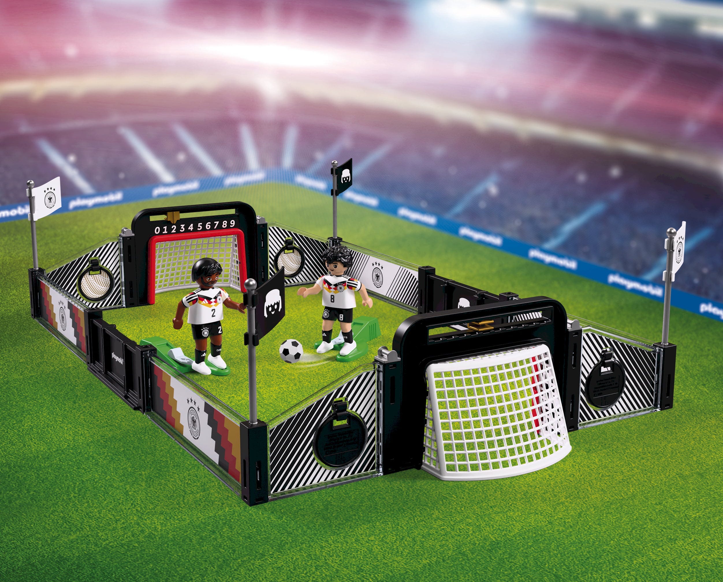 Con questo set PLAYMOBIL puoi portare a casa tua emozionanti allenamenti uno contro uno e un pezzo della Coppa del Mondo. Esercitati con passaggi, contrasti e tiri in porta, oppure gioca partite come i professionisti della DFB.