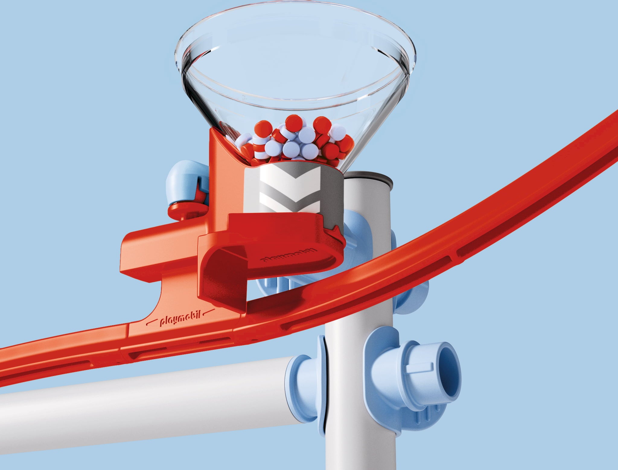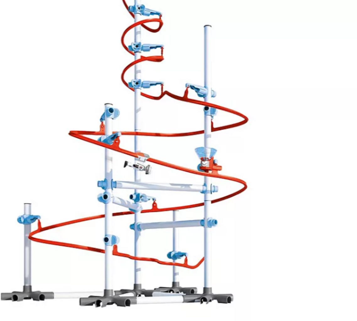 - Elementi vari come tubi, scivoli, tratti ondulati, spirali e imbuto con coriandoli.