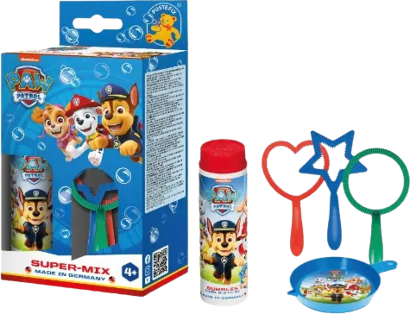 Con PUSTEFIX Super-Mix nel suo allegro design PAW Patrol, ogni giorno diventa una piccola avventura! I tre anelli a forma di cerchio, cuore e stella, creano una varietà di splendide bolle di sapone. Grazie alla comprovata qualità PUSTEFIX, si creano bolle di sapone stabili e iridescenti che faranno la felicità dei bambini.