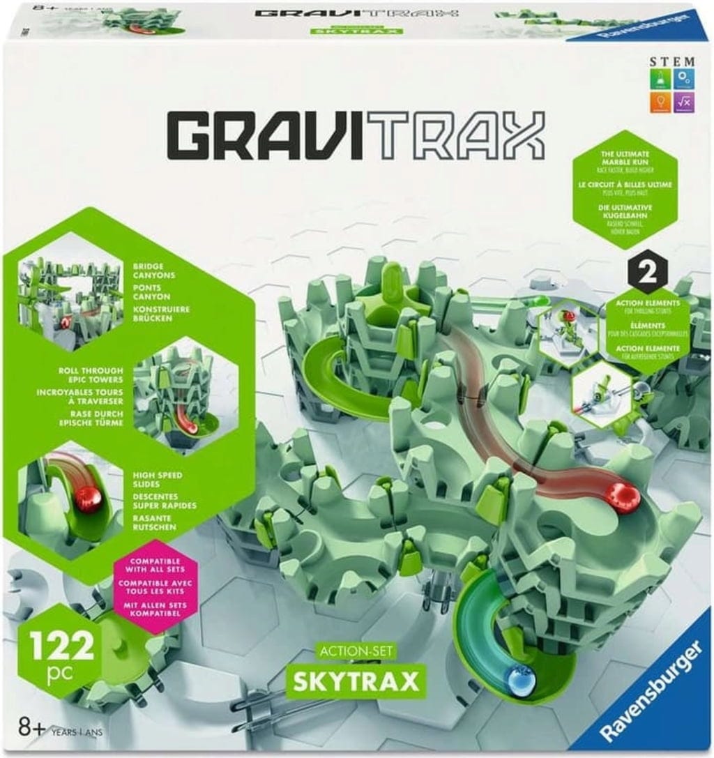 Il cuore del set sono gli innovativi elementi Skytrax. Permettono di far cadere le biglie attraverso i componenti in modo mirato o di recuperarle nuovamente in altezza. Gli scivoli dinamici fanno sfrecciare le biglie a grande velocità intorno alle maestose torri, mentre i ponti sospesi collegano le diverse sezioni della costruzione. I bambini esplorano così in modo ludico principi STEM complessi e imparano a sfruttare impulso e gravità per percorsi sempre più lunghi.