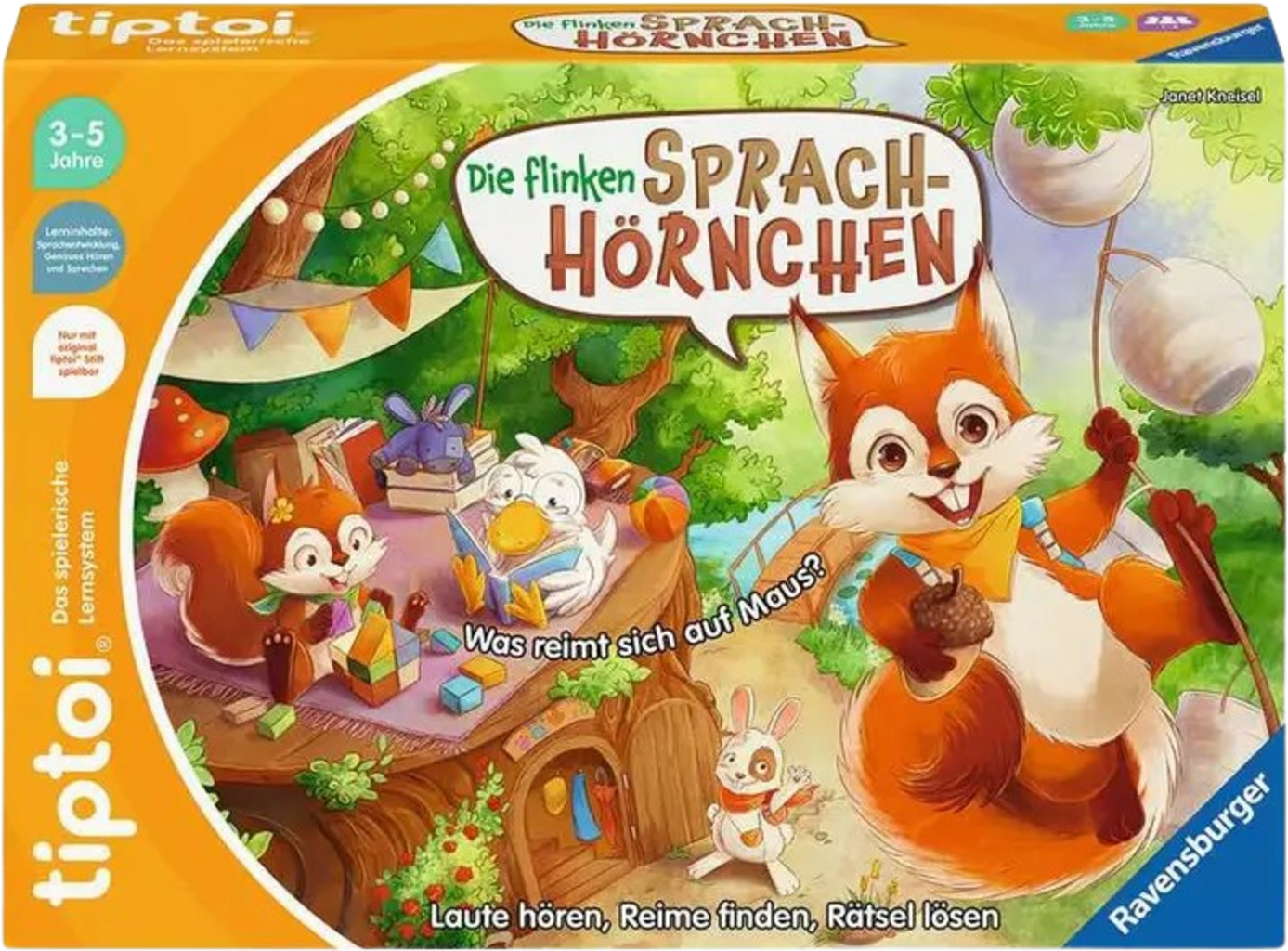 Aiuta gli scoiattoli del linguaggio a riempire la loro riserva! Questo gioco di apprendimento tiptoi trasforma il riconoscimento delle desinenze delle parole, delle rime e la formazione delle frasi in un'entusiasmante avventura nella foresta.
