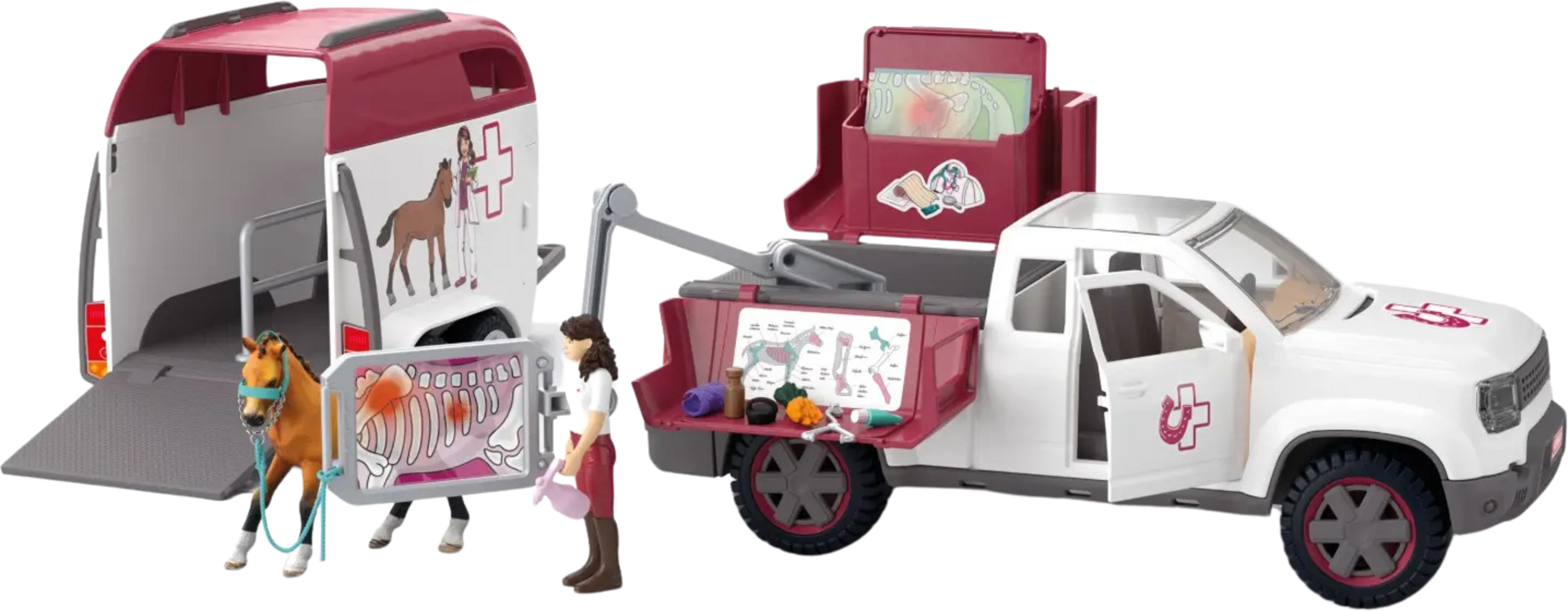 Con l'ambulatorio veterinario mobile, ogni lesione del cavallo viene curata rapidamente! La signora Kramer visita il puledro sul posto con una macchina a raggi X e bende, assicurandosi che tutti i cavalli si sentano a loro agio. Il set dettagliato invita ad avventure fantasiose e può essere portato ovunque grazie al rimorchio e al pick-up.