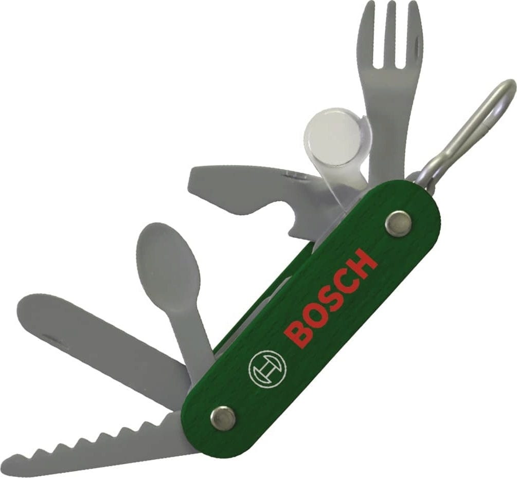 Questo versatile utensile multifunzione dal look Bosch autentico è ideale per i bambini che amano esplorare all'aria aperta o organizzare emozionanti spedizioni nella propria cameretta. Ispirato al classico coltellino svizzero giocattolo, integra diversi strumenti in legno di alta qualità facilmente apribili, pensati per il gioco sicuro. Che si tratti di un picnic immaginario con cucchiaio e forchetta, di usare l'apribottiglie, di segare piccoli oggetti o di osservare minuscoli tesori della natura con la lente d'ingrandimento, le possibilità di gioco creativo sono davvero infinite. Il design robusto è studiato appositamente per le mani dei più piccoli e li aiuta a sviluppare le capacità motorie in modo naturale, grazie alle funzioni pieghevoli da sperimentare.