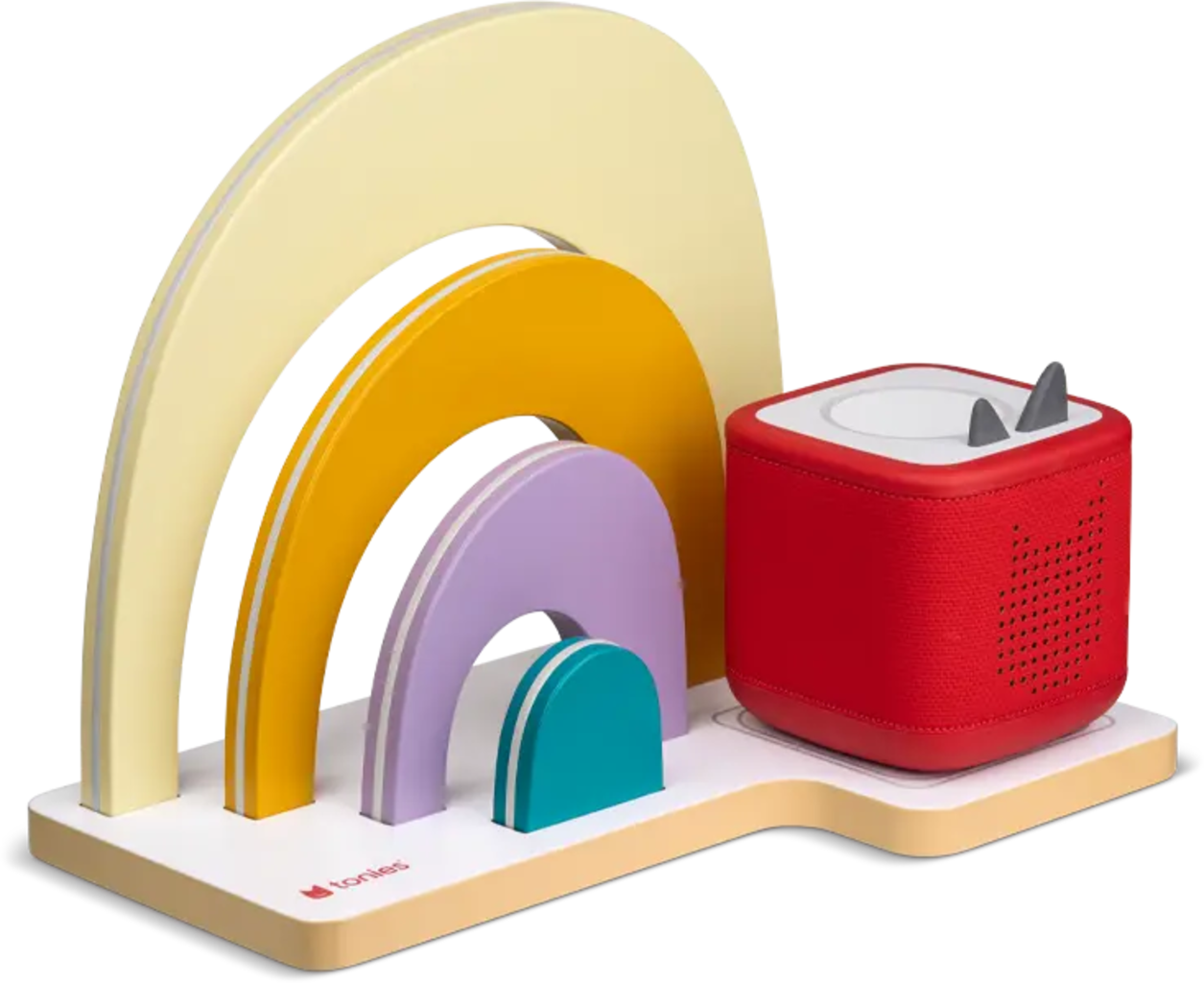 Dai colore alla tua collezione! La mensola da appoggio Arcobaleno offre spazio per fino a 40 Tonie e un posto sicuro per la Toniebox. Le strisce magnetiche integrate mantengono le figure ben stabili anche sui livelli più alti.