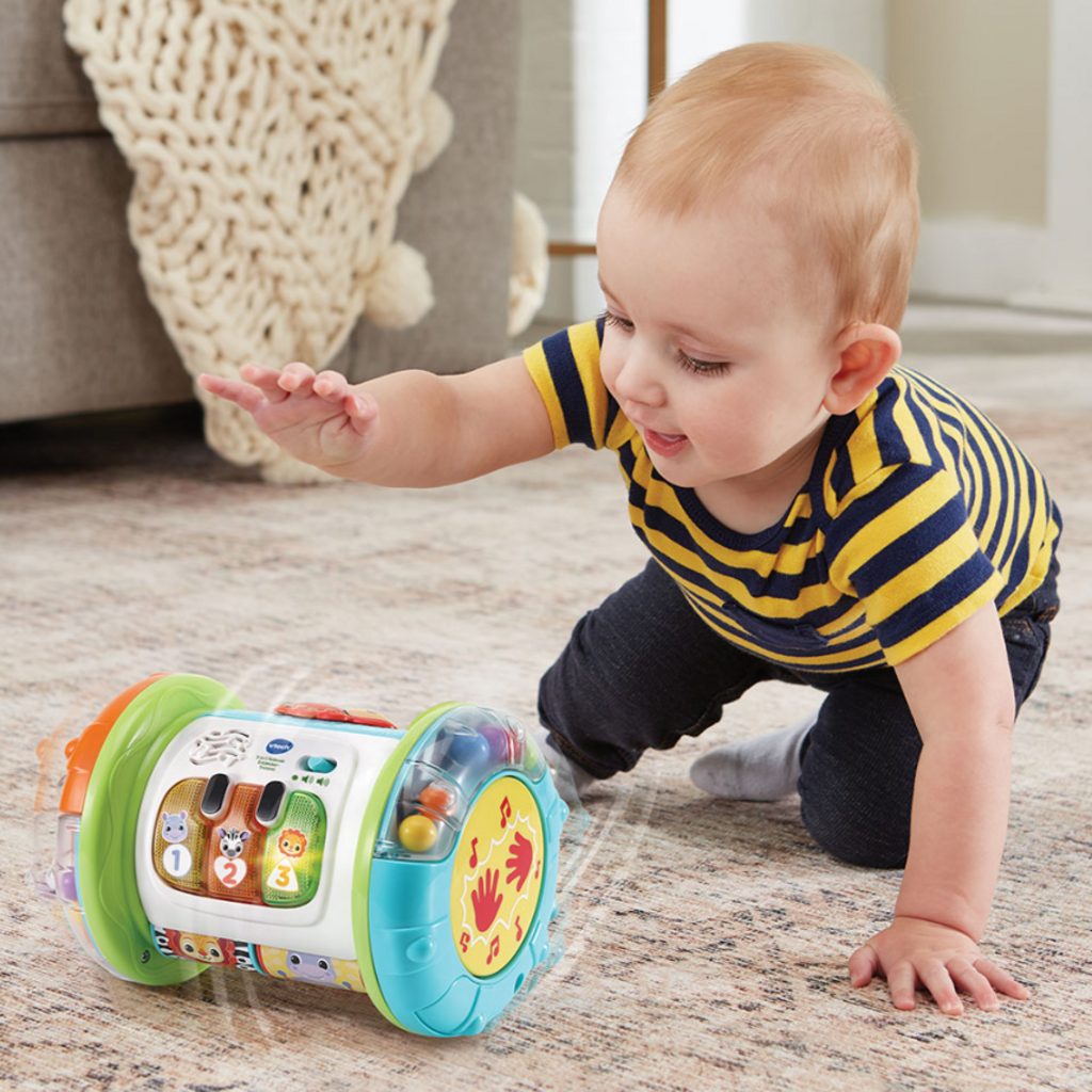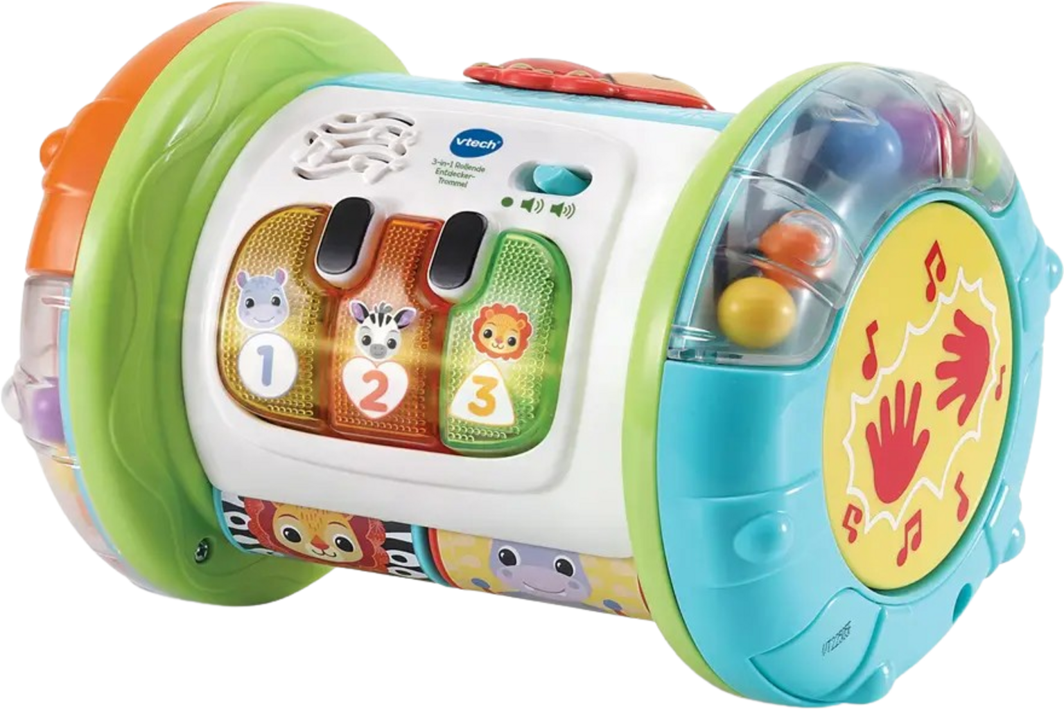 Con il Tamburo Esploratore Rotolante 3 in 1, i piccoli musicisti possono rotolare, suonare il tamburo e scoprire animali, numeri e colori in modo giocoso. Pulsanti interattivi, allegre canzoncine e melodie stimolano in modo creativo le capacità motorie e la curiosità.
