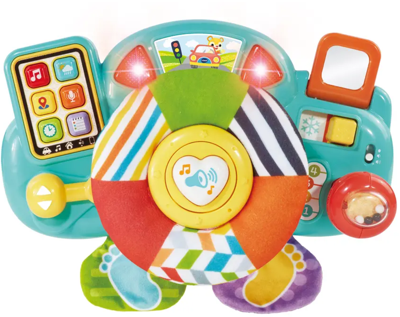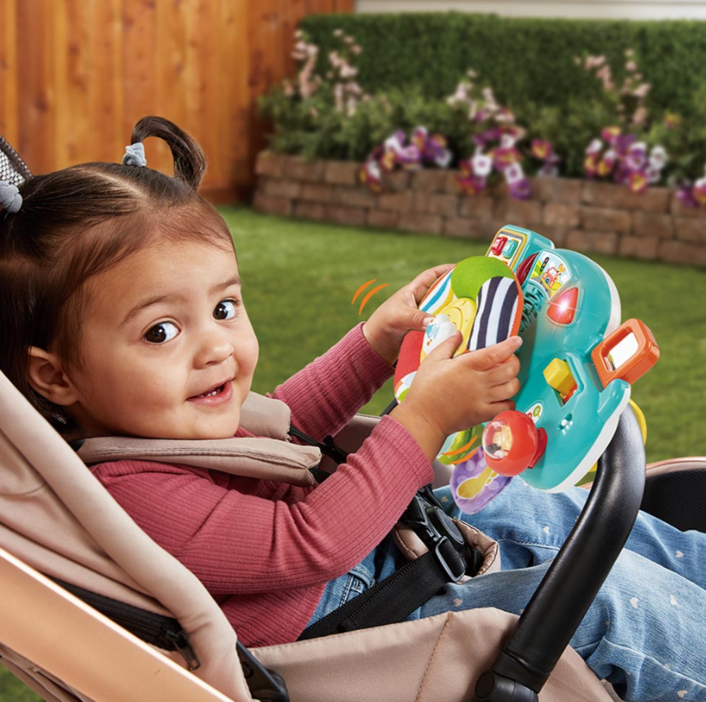 Il volante didattico della linea Baby di VTech mette i piccoli esploratori al posto di guida. Con clacson, frecce direzionali, perline sonaglio, tasti colorati ed elementi mobili, i bambini vivono un'esperienza di gioco interattiva che stimola i sensi e favorisce in modo naturale il riconoscimento di colori e suoni, oltre allo sviluppo delle capacità motorie.