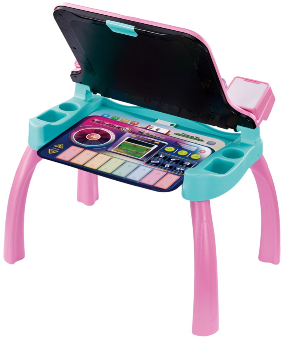- 6 funzioni: scrivania interattiva, tablet interattivo, stazione musicale con tasti del pianoforte, superficie LED per scrivere con penna, lavagna in gesso, stazione creativa tipo cavalletto